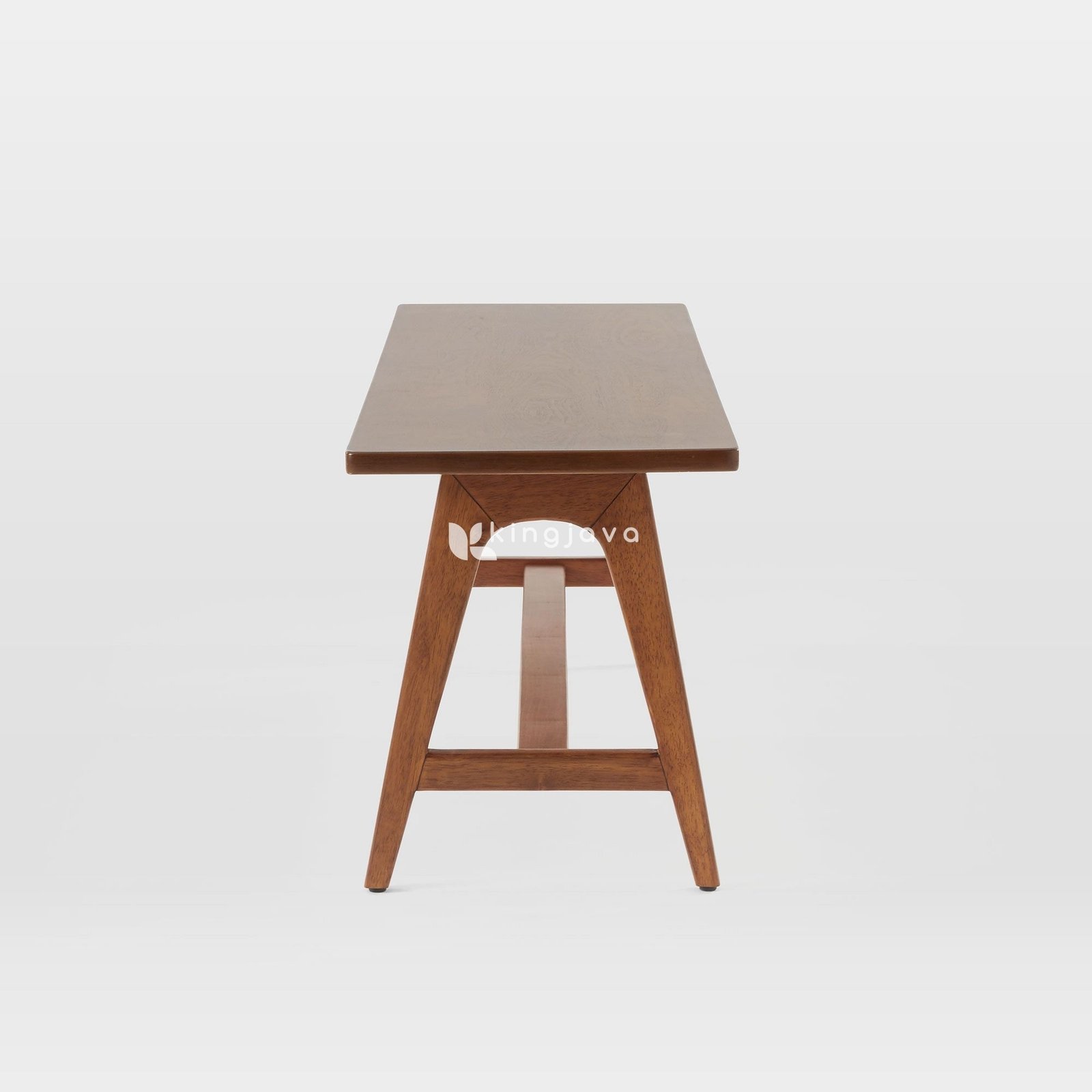 Konstruksi bangku ini dirancang dengan cermat untuk memastikan stabilitas dan kenyamanan. Bagian atas bangku yang lebar dan rata memberikan ruang yang luas untuk duduk, sementara kaki-kaki yang meruncing ke bawah memberikan sentuhan elegan. Sambungan antar komponen dibuat dengan teknik yang kokoh, menjamin bangku ini akan bertahan selama bertahun-tahun. Detail pada bagian bawah bangku, terdapat palang yang menghubungkan kedua sisi kaki, memberikan tambahan stabilitas dan juga berfungsi sebagai tempat kaki yang nyaman.