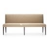 Bangku ini memiliki sandaran punggung yang rendah dan dudukan yang lebar, keduanya dilapisi kain berwarna krem yang memberikan tekstur visual yang menarik dan sentuhan lembut. Kain tersebut tampak tahan lama dan nyaman untuk diduduki dalam waktu lama. Rangkanya terbuat dari kayu solid yang kuat dan kokoh. Kaki-kakinya yang ramping dan sedikit meruncing ke bawah memberikan kesan ringan dan modern. Warna kaki kayu adalah coklat tua keabu-abuan, memberikan kontras yang menarik dengan warna krem pada kain pelapis. Finishing pada kayu terlihat halus dan memberikan kesan mewah.