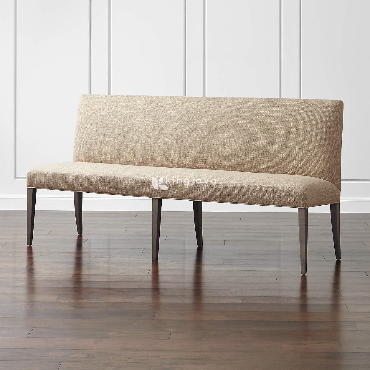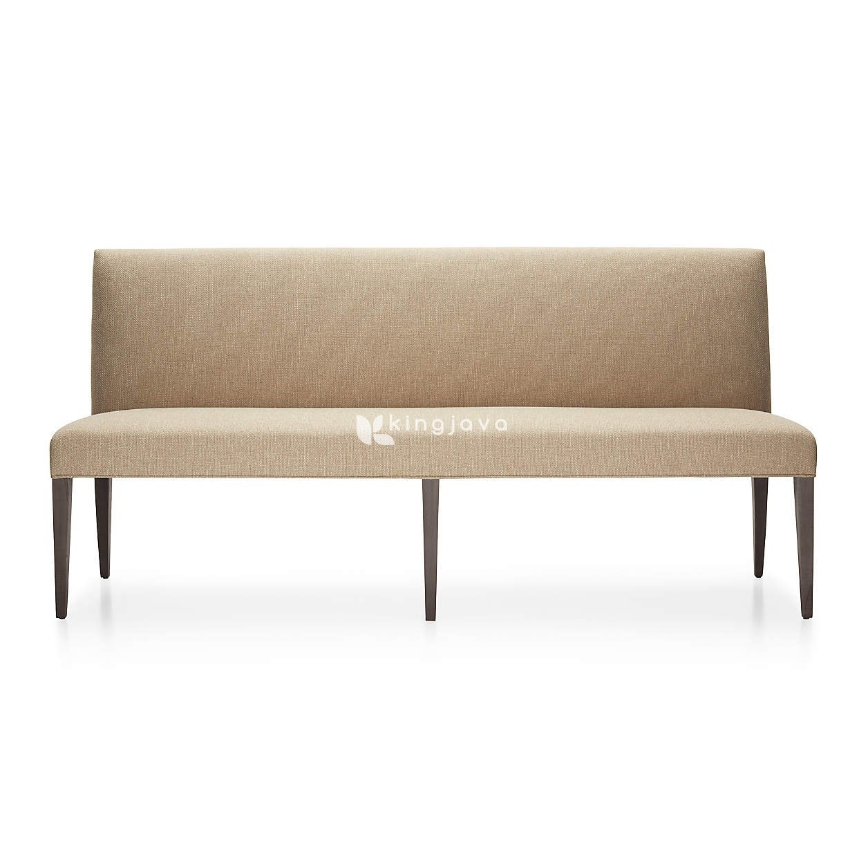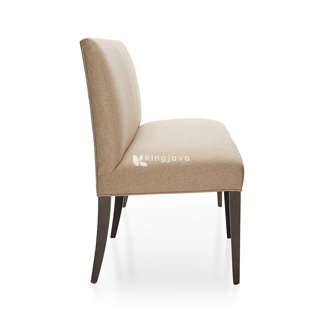 Bangku ini memiliki sandaran punggung yang rendah dan dudukan yang lebar, keduanya dilapisi kain berwarna krem yang memberikan tekstur visual yang menarik dan sentuhan lembut. Kain tersebut tampak tahan lama dan nyaman untuk diduduki dalam waktu lama. Rangkanya terbuat dari kayu solid yang kuat dan kokoh. Kaki-kakinya yang ramping dan sedikit meruncing ke bawah memberikan kesan ringan dan modern. Warna kaki kayu adalah coklat tua keabu-abuan, memberikan kontras yang menarik dengan warna krem pada kain pelapis. Finishing pada kayu terlihat halus dan memberikan kesan mewah.