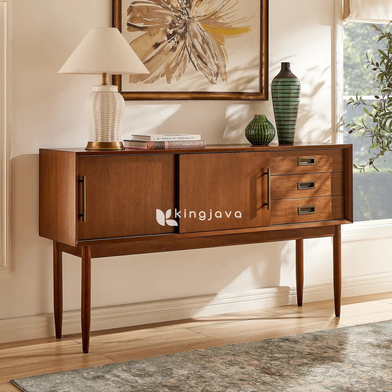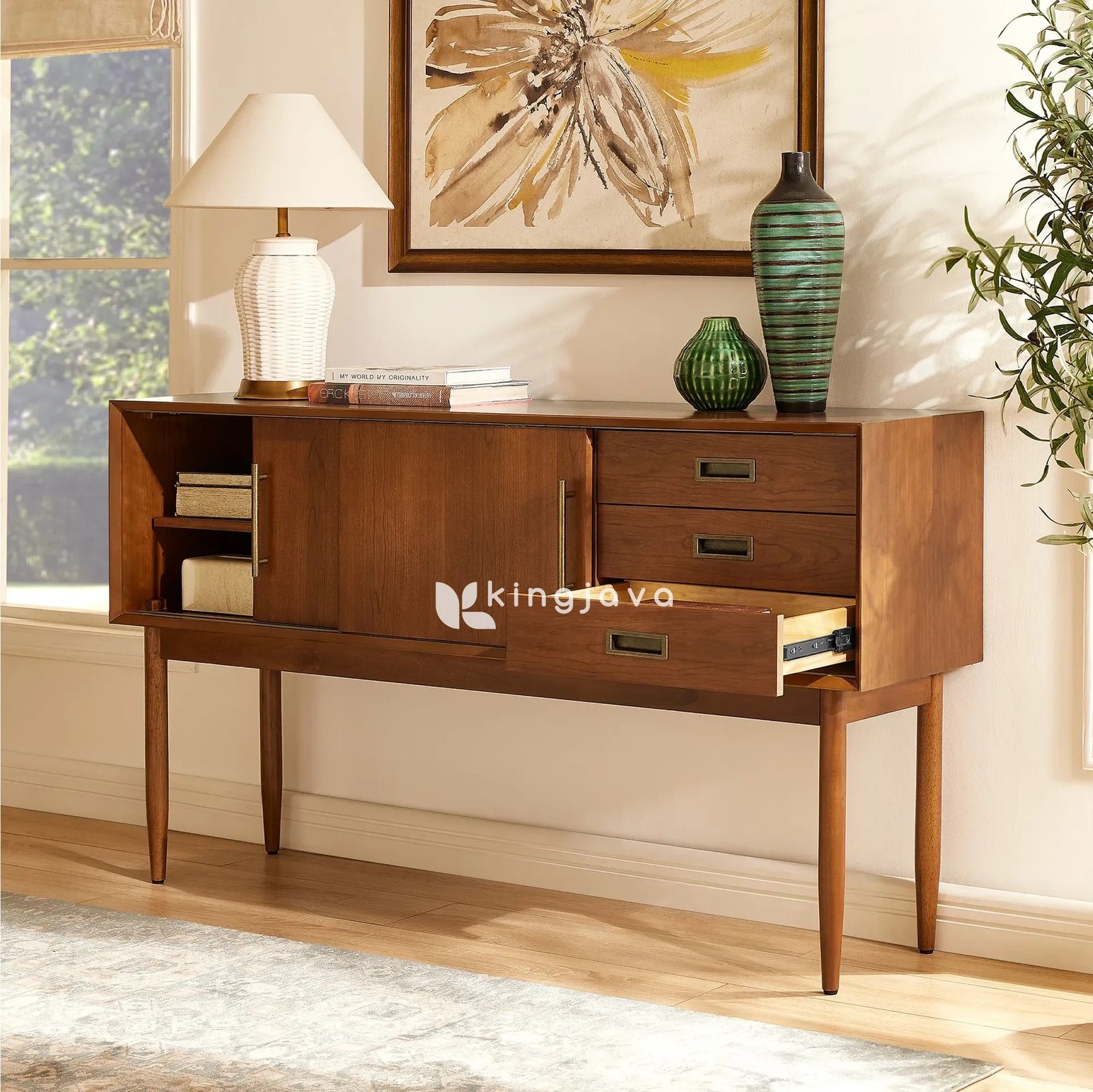 Ruang penyimpanan dengan pintu geser yang luas memudahkan Anda menyimpan berbagai peralatan makan atau barang-barang dekoratif. Desain Mid-Century modern dilengkapi laci-laci yang memberikan solusi penyimpanan tambahan untuk barang-barang kecil. Tak hanya itu, handle kuningan antik menambah sentuhan elegan pada tampilan keseluruhan. Oleh karena itu, kombinasi fungsi dan gaya menjadikan bufet ini pilihan yang cerdas.
