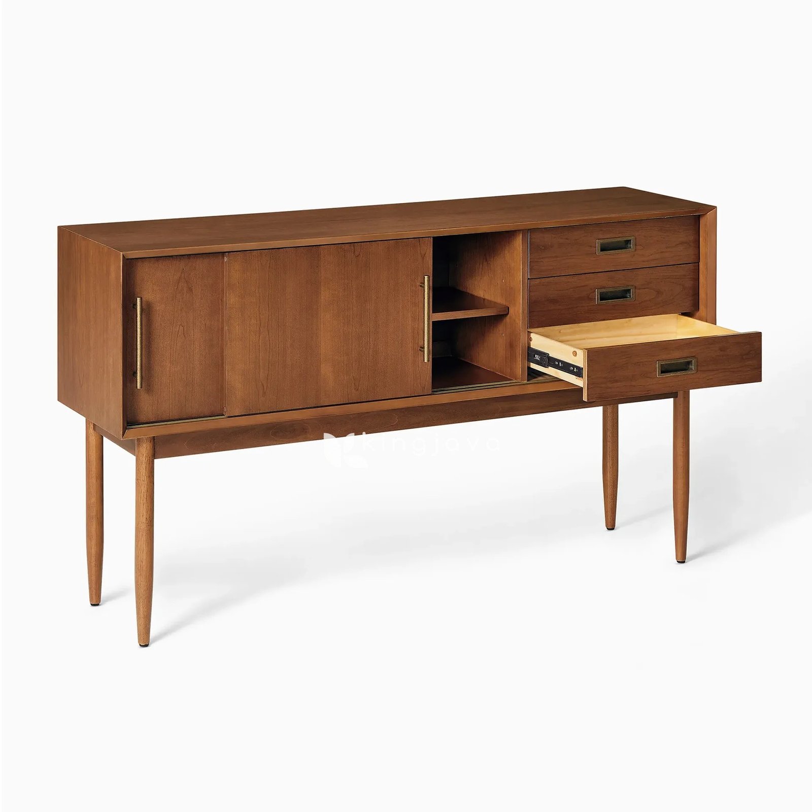 - Nama Produk: Bufet Kayu Jati Mid-Century Modern dengan Laci & Pintu Geser – Nova
