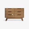Bufet ini memiliki enam laci berukuran besar yang disusun dalam dua baris, memberikan ruang penyimpanan yang luas untuk pakaian, linen, peralatan makan, atau barang-barang pribadi lainnya. Setiap laci dilengkapi dengan pegangan tersembunyi yang dipahat langsung ke dalam kayu, menciptakan tampilan yang mulus dan tanpa gangguan. Struktur bufet ditopang oleh kaki-kaki yang meruncing dengan sudut yang elegan, menambah sentuhan modern pada desain klasik.