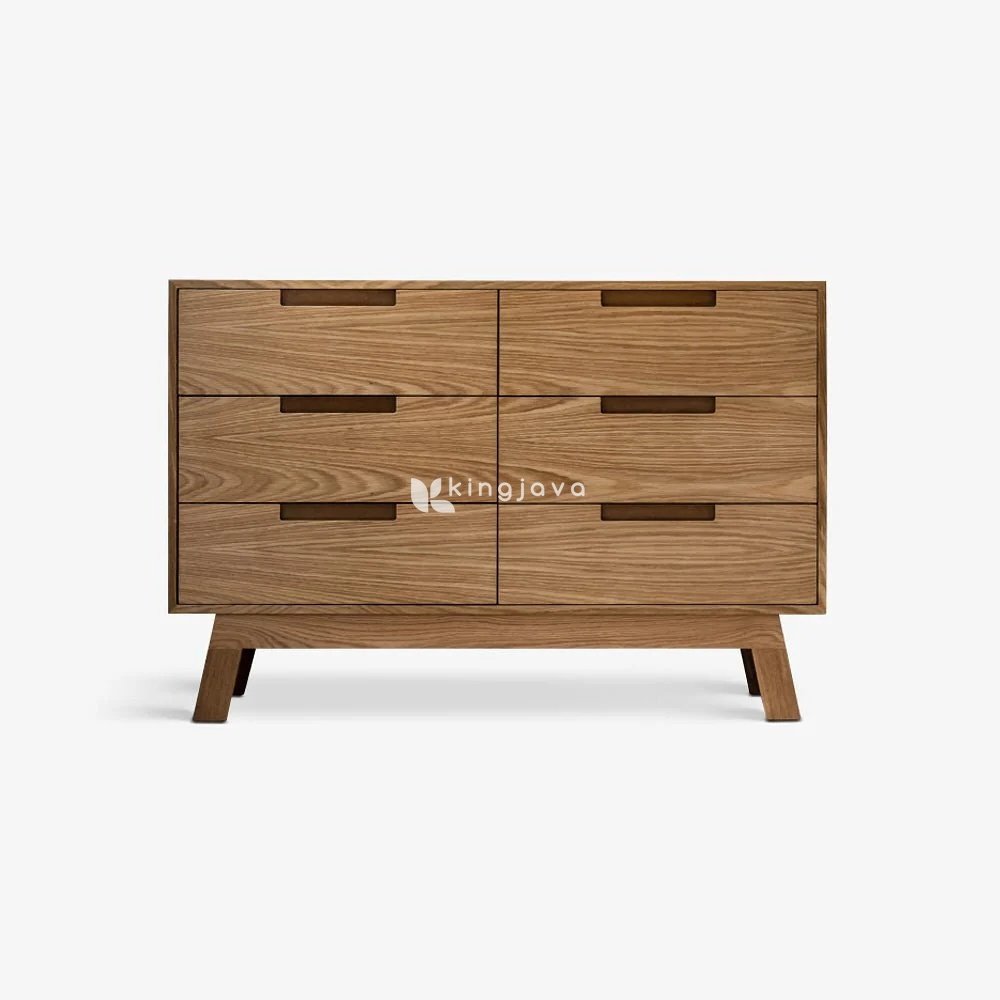 Bufet ini memiliki enam laci berukuran besar yang disusun dalam dua baris, memberikan ruang penyimpanan yang luas untuk pakaian, linen, peralatan makan, atau barang-barang pribadi lainnya. Setiap laci dilengkapi dengan pegangan tersembunyi yang dipahat langsung ke dalam kayu, menciptakan tampilan yang mulus dan tanpa gangguan. Struktur bufet ditopang oleh kaki-kaki yang meruncing dengan sudut yang elegan, menambah sentuhan modern pada desain klasik.