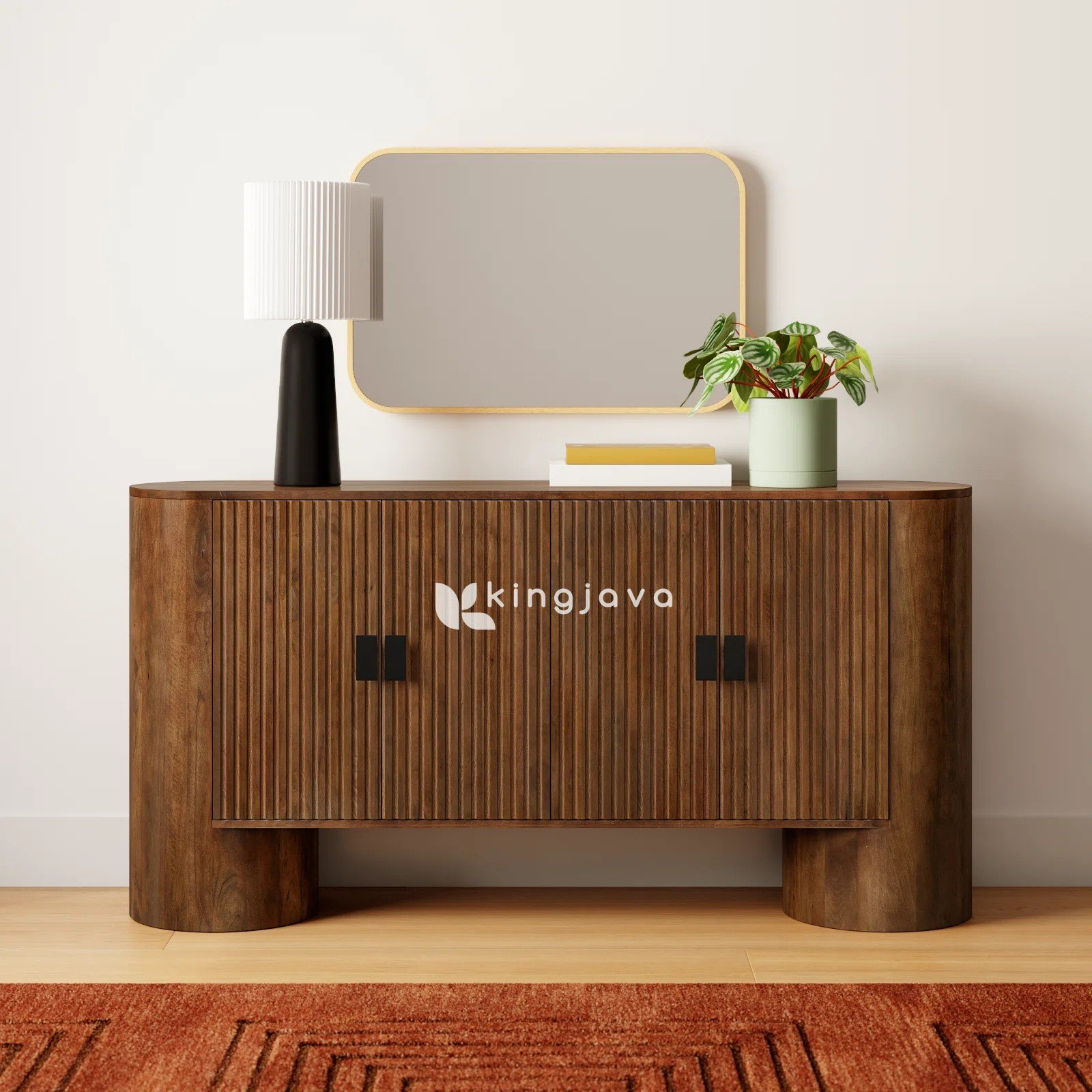 Buffet Kayu Jati Solid Modern Minimalis dengan Pintu Bertekstur – Vino adalah solusi ideal untuk Anda yang mencari penyimpanan elegan sekaligus statement piece untuk ruang tamu atau ruang makan. Buffet ini menampilkan desain modern minimalis dengan siluet membulat yang lembut. Pintu-pintunya bertekstur garis vertikal yang memberikan sentuhan visual yang menarik. Warna cokelat natural kayu jati menambah kehangatan dan kesan alami. Di sisi lain, kaki buffet berbentuk silinder memberikan kesan kokoh dan stabil. Dengan demikian, buffet ini akan menjadi focal point yang menawan di ruangan Anda.