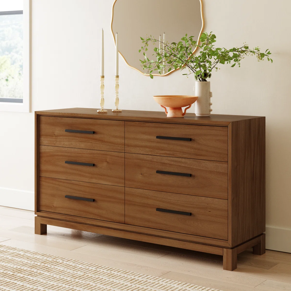 Ruang penyimpanan enam laci yang lega memudahkan Anda mengatur pakaian, linen, atau barang-barang pribadi lainnya. Dengan demikian, ruangan Anda akan selalu rapi dan terorganisir. Selain itu, permukaan atas buffet dapat digunakan untuk memajang dekorasi, foto, atau lampu hias. Tak hanya itu, buffet ini sangat ideal untuk ruang tamu, kamar tidur, atau ruang keluarga. Oleh karena itu, buffet ini menjadi solusi penyimpanan serbaguna.