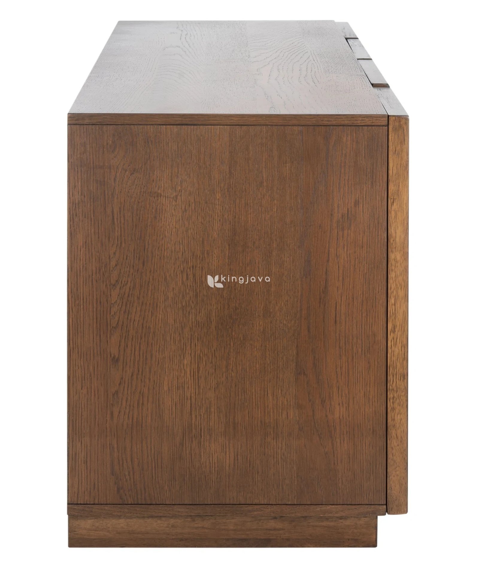 Finishing Semi-Glossy Natural Teak diaplikasikan dengan hati-hati untuk melindungi kayu sekaligus menonjolkan warna cokelat alami yang kaya dan tekstur serat kayu jati yang indah. Permukaan credenza terasa halus dan memiliki kilau lembut yang memantulkan cahaya secara subtil, menambah kesan mewah dan bersih. Bagian atas credenza menampilkan permukaan datar yang luas, ideal untuk menempatkan dekorasi, lampu, atau sebagai alas untuk TV.
