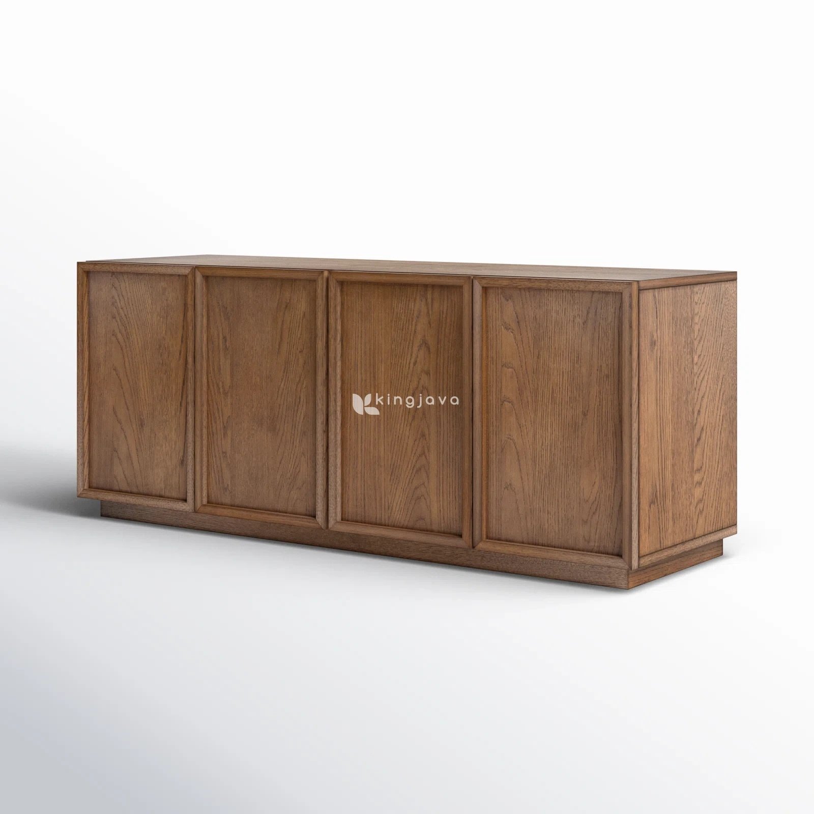 Desain credenza ini menganut gaya minimalis modern, ditandai dengan garis-garis bersih dan bentuk persegi panjang yang ramping. Empat pintu kabinet yang berjejer rapi menjadi fitur utama, masing-masing dilengkapi dengan detail panel berbingkai yang sedikit menonjol, menciptakan dimensi visual yang menarik tanpa mengorbankan kesederhanaan. Detail bingkai ini menambah sentuhan elegan dan kesan kokoh pada keseluruhan unit. Konstruksi yang presisi terlihat dari setiap sambungan yang mulus dan rapi, mengindikasikan kualitas pengerjaan tingkat tinggi.