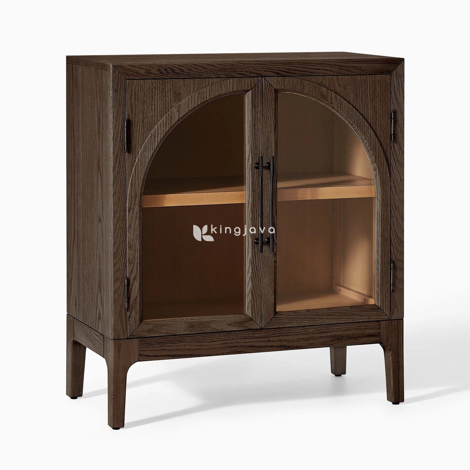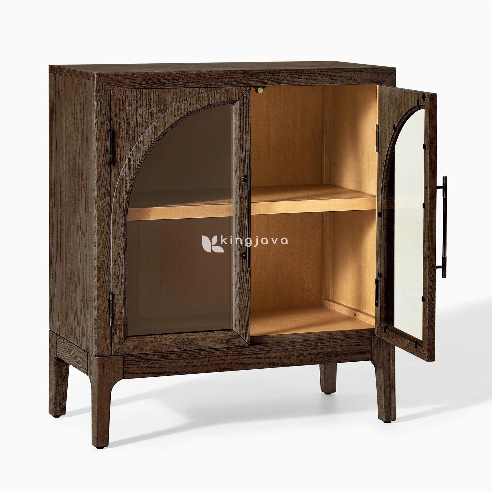 Fitur utama kabinet ini adalah dua pintu kaca tempered yang dirancang dengan bentuk lengkung yang elegan. Lengkungan ini tidak hanya menambah sentuhan artistik dan unik, tetapi juga memungkinkan barang-barang koleksi Anda terlihat jelas di dalamnya, sekaligus melindunginya dari debu. Engsel dan handle pintu terbuat dari logam berwarna hitam matte yang kokoh, memberikan kontras yang apik dengan warna kayu gelap dan menjamin penggunaan yang mulus serta tahan lama. Saat pintu dibuka, interior kabinet mengungkapkan keindahan kayu solid dengan finishing natural yang lebih terang, menciptakan kontras visual yang hangat dan mengundang.