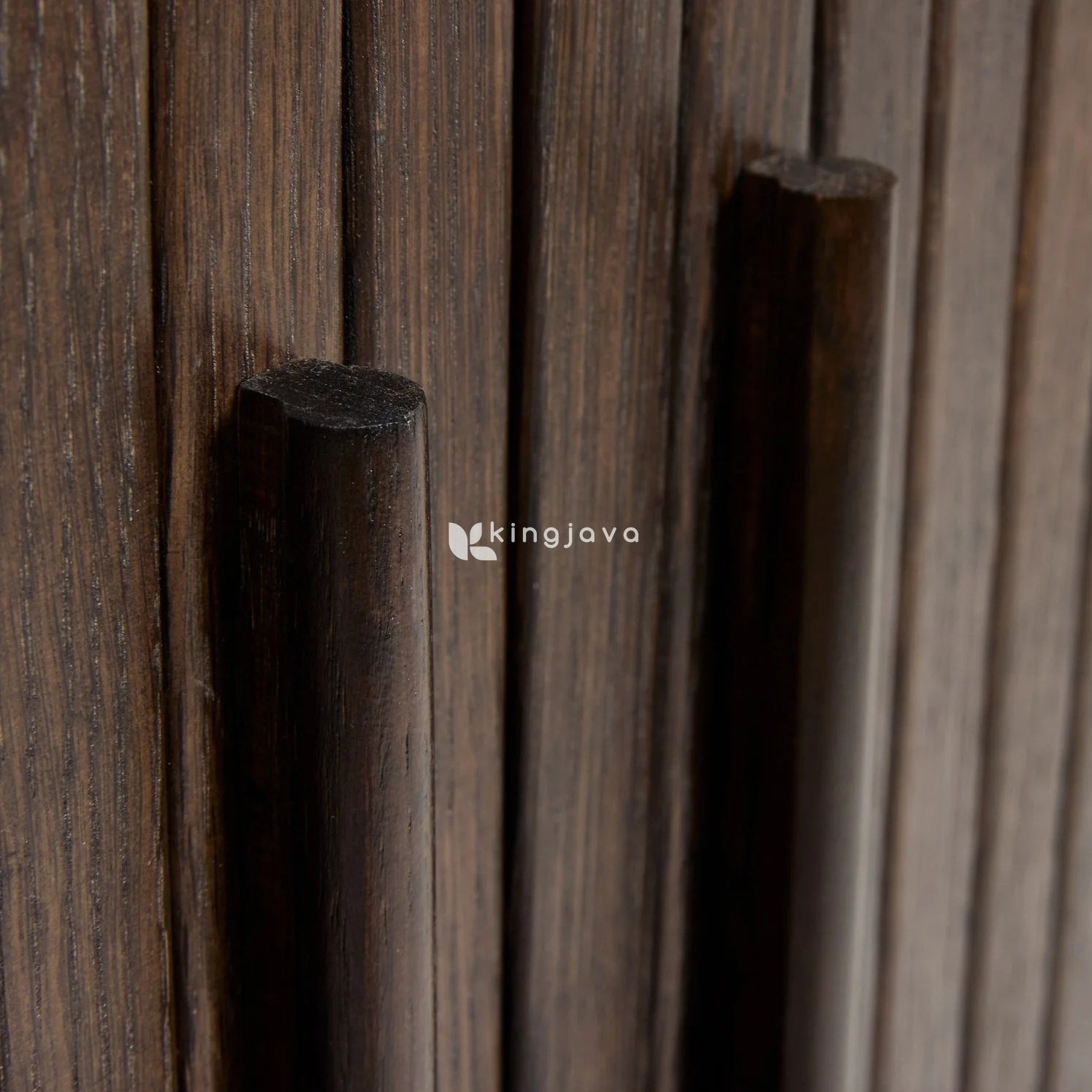 Material utama kabinet ini adalah kayu solid dengan finishing yang menonjolkan serat alami kayu. Warna cokelat tua memberikan sentuhan hangat dan mewah, sementara kaki-kaki yang ramping memberikan kesan ringan dan modern. Gagang pintu yang panjang dan ramping terbuat dari material yang sama dengan kabinet.