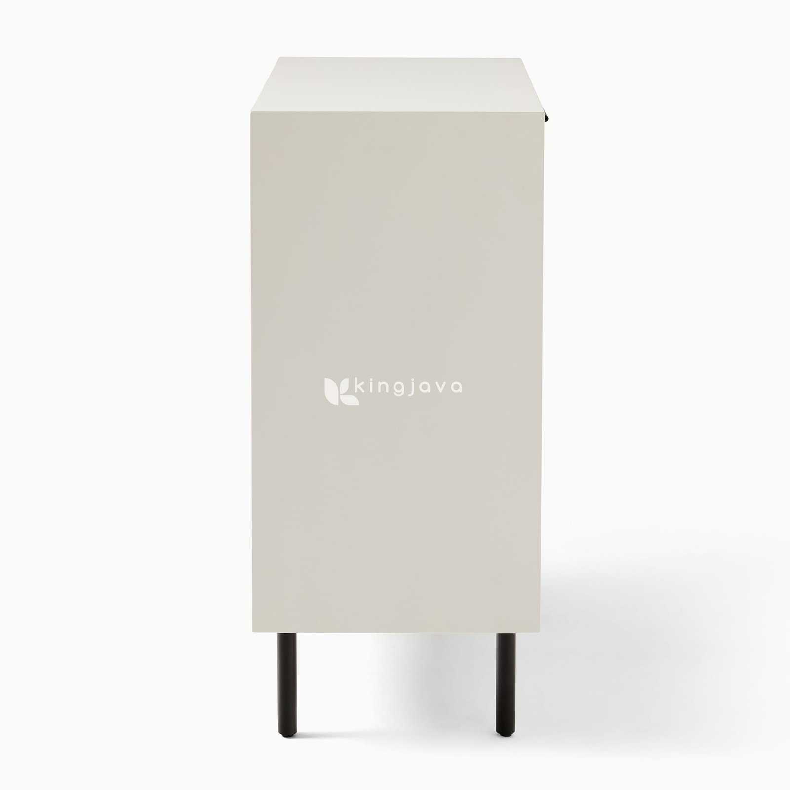 Detail konstruksi kabinet ini menunjukkan perhatian terhadap kualitas. Sambungan yang rapi dan presisi memastikan kekokohan dan daya tahan. Kaki-kaki kabinet terbuat dari besi solid berbentuk silinder dengan finishing powder coating matte black, memberikan penopang yang stabil sekaligus menambah aksen modern yang kontras. Handle pintu juga terbuat dari besi dengan finishing matte black, didesain minimalis berbentuk bar horizontal yang terpasang di bagian atas pintu, menyatu harmonis dengan keseluruhan estetika. Di balik pintu, terdapat ruang penyimpanan yang fungsional dengan satu rak internal yang membagi ruang menjadi dua kompartemen, ideal untuk menyimpan berbagai barang mulai dari buku, peralatan makan, hingga perlengkapan pribadi, menjaga kerapian ruangan Anda. Proporsi kabinet yang ringkas membuatnya sangat fleksibel untuk diletakkan di berbagai area, dari ruang tamu, lorong, hingga kamar tidur.