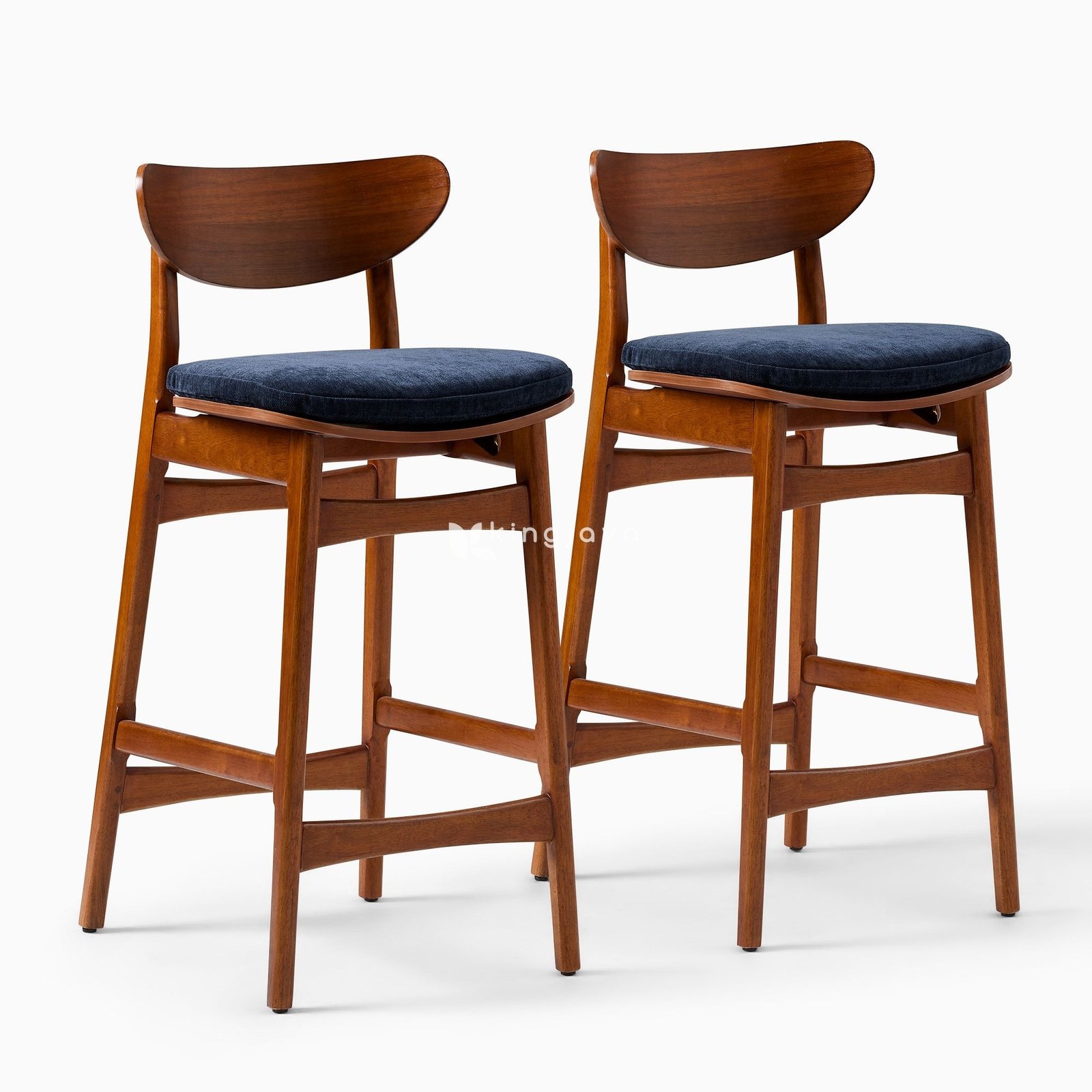 - Nama Produk: Kursi Bar Kayu Jati Solid Mid-Century Modern Sandaran Melengkung & Dudukan Kain Biru Tua – Cipher