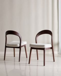 Rangka kursi dibuat dari kayu solid pilihan dengan finishing halus dan presisi, menampilkan karakter alami kayu yang hangat dan berkelas. Desain sandaran melengkung memberikan dukungan ergonomis pada punggung, sementara dudukan dilengkapi bantalan empuk berlapis kain premium yang nyaman untuk penggunaan jangka panjang.
