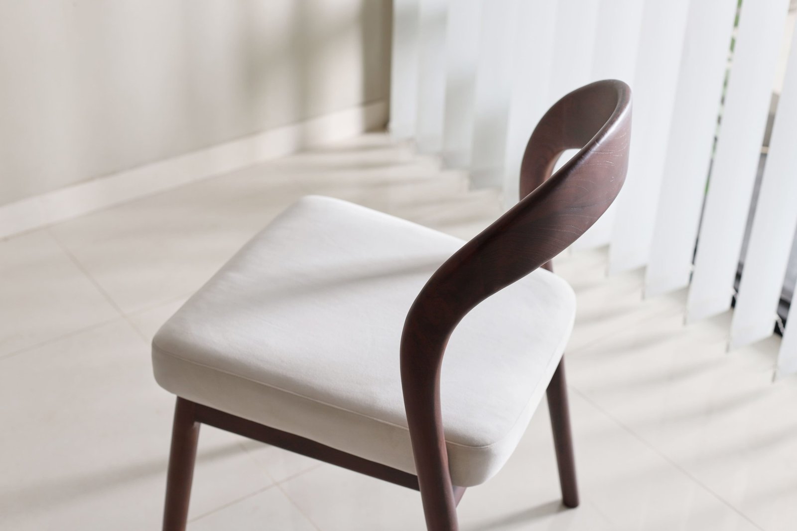 Rangka kursi dibuat dari kayu solid pilihan dengan finishing halus dan presisi, menampilkan karakter alami kayu yang hangat dan berkelas. Desain sandaran melengkung memberikan dukungan ergonomis pada punggung, sementara dudukan dilengkapi bantalan empuk berlapis kain premium yang nyaman untuk penggunaan jangka panjang.