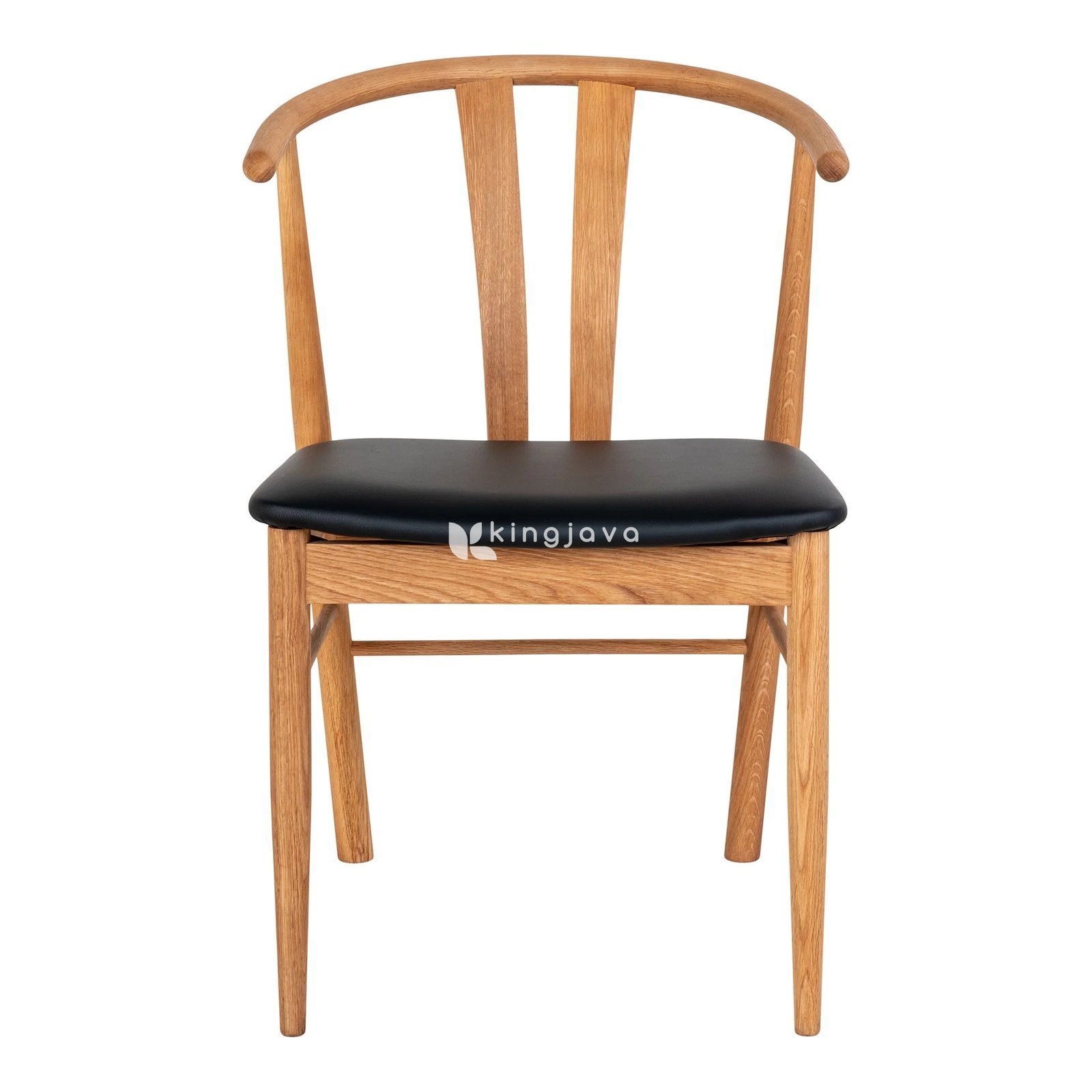 Material utama kursi ini adalah kayu solid yang kuat dan tahan lama. Finishing semi-glossy natural pada kayu menonjolkan serat alami kayu, memberikan kesan hangat dan alami pada ruangan. Dudukan kursi dilapisi dengan kulit sintetis berwarna hitam yang memberikan kontras visual yang menarik dengan warna kayu. Selain itu, lapisan kulit sintetis ini juga mudah dibersihkan dan dirawat, menjadikannya pilihan praktis untuk penggunaan sehari-hari.