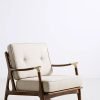 Dua bantalan tebal dan empuk, untuk duduk dan sandaran punggung, dilapisi dengan kain linen blend berwarna krem terang yang bertekstur lembut, menawarkan kenyamanan maksimal dan rasa hangat. Bantalan sandaran punggung diperkuat dengan detail tufting berupa dua kancing yang menciptakan pola berlekuk indah, menambah kedalaman visual dan sentuhan klasik. Bagian belakang sandaran kursi ini menampilkan desain kisi-kisi vertikal yang terintegrasi rapi ke dalam rangka kayu, tidak hanya menambah daya tarik visual dari segala sudut tetapi juga memberikan dukungan struktural yang kuat dan sirkulasi udara yang baik. Proporsi kursi ini dirancang dengan cermat, menciptakan siluet yang seimbang dan mengundang untuk relaksasi.