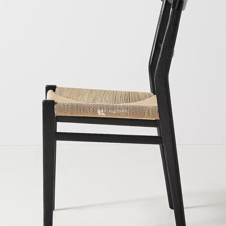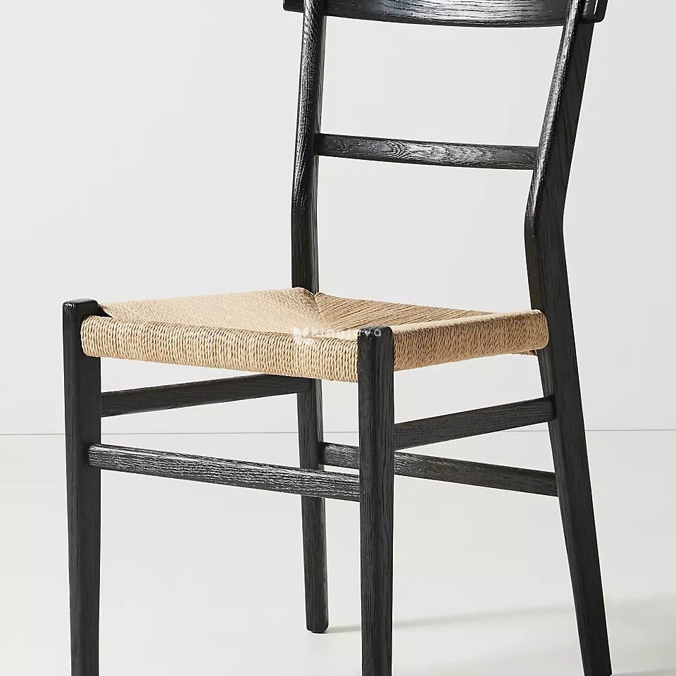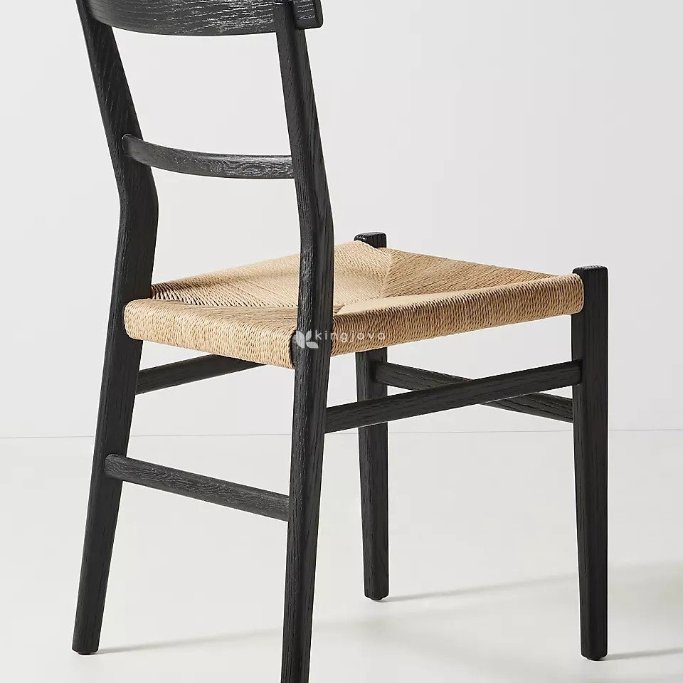 Dudukan kursi terbuat dari anyaman serat alami yang memberikan kenyamanan dan sentuhan tekstur yang menarik. Anyaman ini tidak hanya menambah nilai estetika, tetapi juga memungkinkan sirkulasi udara yang baik, sehingga kursi tetap nyaman digunakan dalam waktu lama. Detail konstruksi seperti palang penyangga di bawah dudukan kursi menambah kekuatan dan stabilitas.