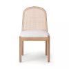 Sandaran kursi dihiasi dengan anyaman rotan alami yang memberikan tekstur unik dan sirkulasi udara yang baik, menjadikannya nyaman untuk diduduki dalam waktu lama. Bagian dudukan dilapisi dengan kain lembut berwarna krem yang memberikan kenyamanan ekstra dan tampilan yang elegan. Finishing semi-glossy natural pada kayu jati menonjolkan serat alami yang indah dan memberikan perlindungan terhadap goresan dan noda. Desain minimalis kursi ini membuatnya mudah dipadukan dengan berbagai gaya dekorasi, baik modern, skandinavia, maupun klasik.