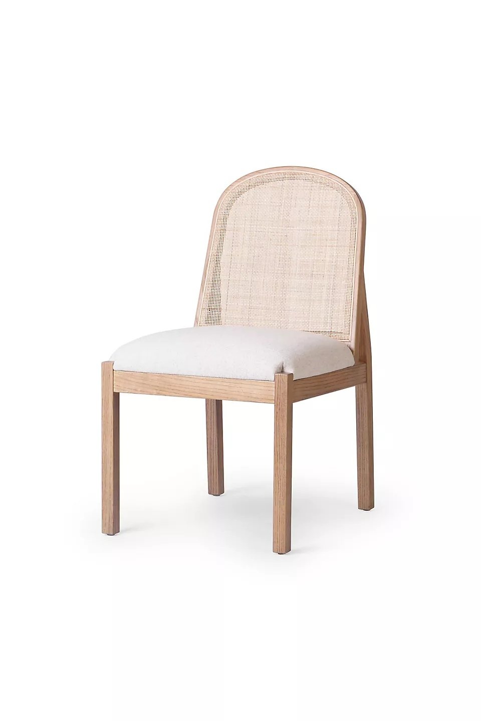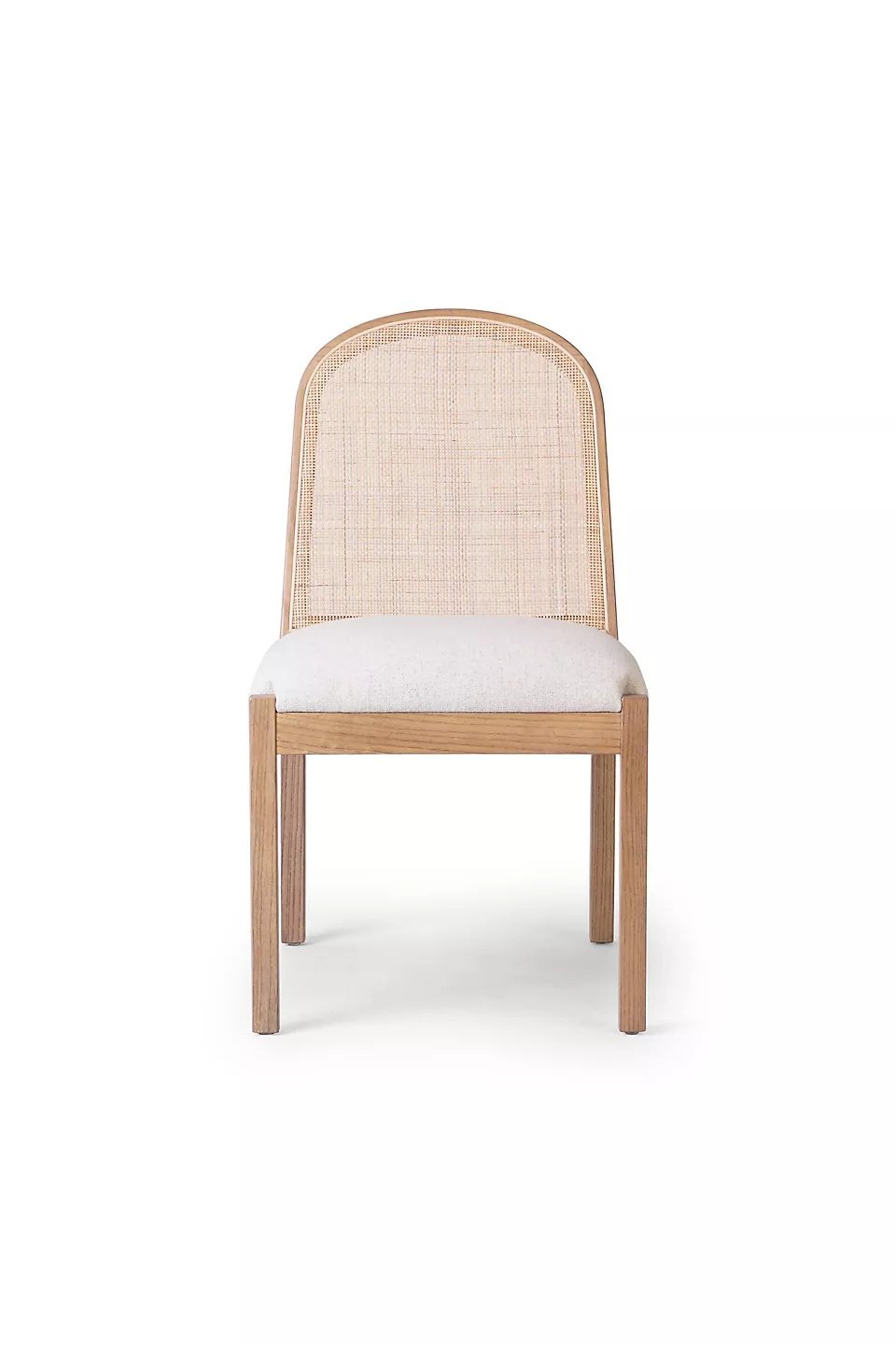 Sandaran kursi dihiasi dengan anyaman rotan alami yang memberikan tekstur unik dan sirkulasi udara yang baik, menjadikannya nyaman untuk diduduki dalam waktu lama. Bagian dudukan dilapisi dengan kain lembut berwarna krem yang memberikan kenyamanan ekstra dan tampilan yang elegan. Finishing semi-glossy natural pada kayu jati menonjolkan serat alami yang indah dan memberikan perlindungan terhadap goresan dan noda. Desain minimalis kursi ini membuatnya mudah dipadukan dengan berbagai gaya dekorasi, baik modern, skandinavia, maupun klasik.