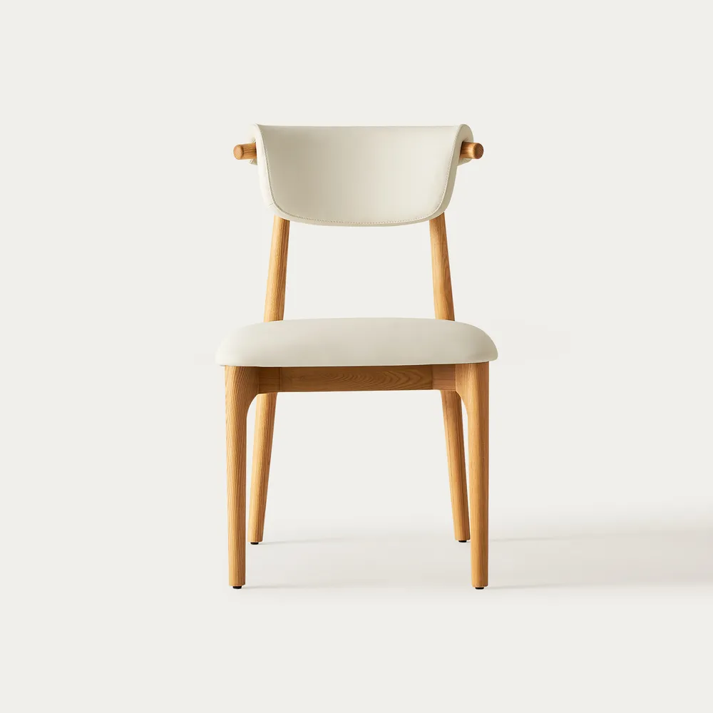 Kursi Kayu Solid Minimalis Modern Sandaran Kulit – Glint hadir dengan desain yang memukau untuk melengkapi ruang makan atau ruang kerja Anda. Kursi ini memadukan kehangatan kayu solid dengan sentuhan elegan kulit sintetis berwarna krem. Bentuknya minimalis dengan garis-garis bersih, namun tetap nyaman berkat sandaran punggung melengkung dan dudukan empuk. Tak hanya itu, detail kayu pada bagian atas sandaran menambah sentuhan unik dan artistik. Dengan demikian, kursi ini menciptakan suasana modern dan nyaman di ruangan.