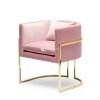 Rangka metal kursi ini memiliki finishing warna emas yang memberikan sentuhan mewah dan glamor pada desain keseluruhan. Kain pelapis kursi berwarna merah muda lembut, dengan tekstur halus yang mengundang sentuhan. Jahitan yang rapi dan presisi menunjukkan perhatian terhadap detail dan kualitas pembuatan.