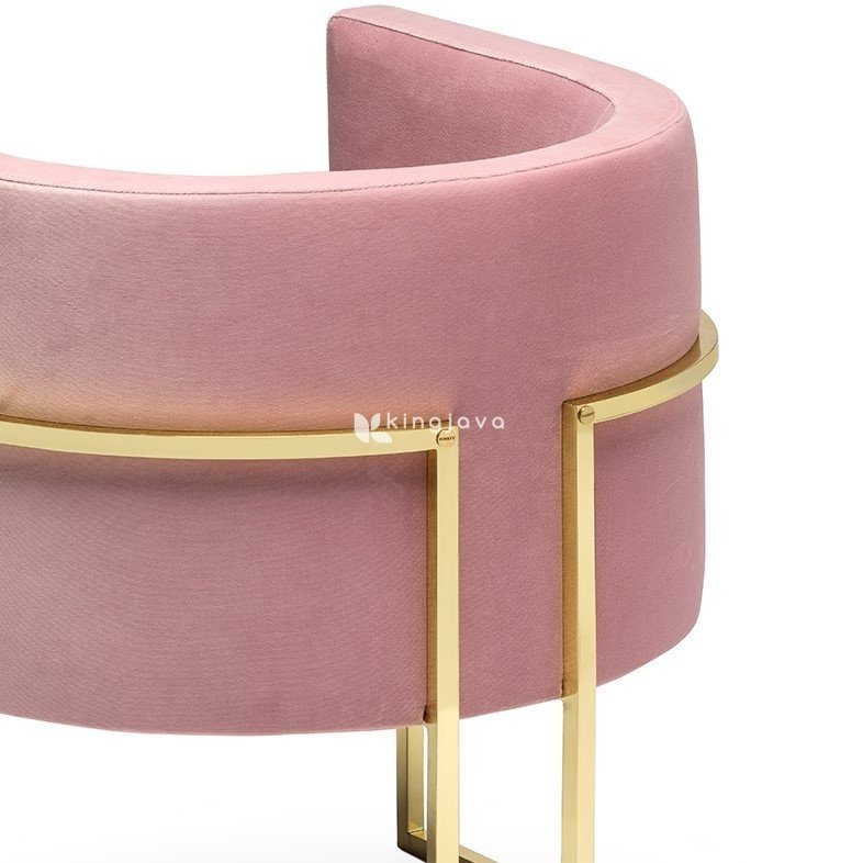 Rangka metal kursi ini memiliki finishing warna emas yang memberikan sentuhan mewah dan glamor pada desain keseluruhan. Kain pelapis kursi berwarna merah muda lembut, dengan tekstur halus yang mengundang sentuhan. Jahitan yang rapi dan presisi menunjukkan perhatian terhadap detail dan kualitas pembuatan.