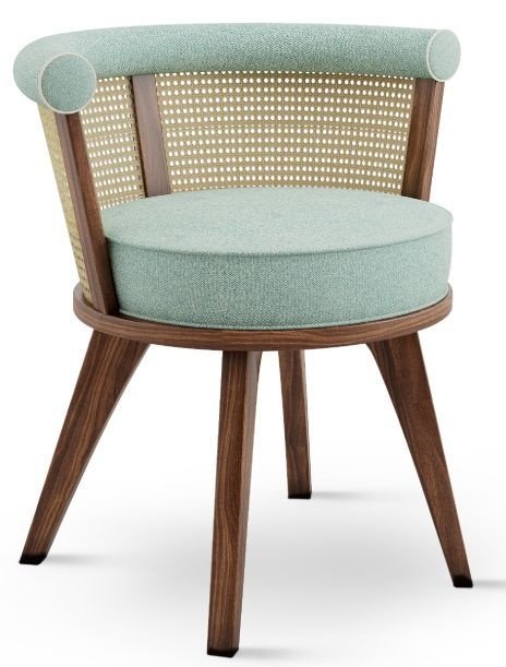 Bagian sandaran kursi diisi dengan anyaman rotan alami yang memberikan sirkulasi udara optimal, menjaga Anda tetap sejuk dan nyaman bahkan dalam cuaca hangat. Bagian atas sandaran dan dudukan dilapisi dengan kain kanvas berwarna hijau lembut yang memberikan sentuhan lembut dan nyaman saat diduduki. Detail silinder pada bagian atas sandaran menambah sentuhan unik dan modern pada desain keseluruhan.