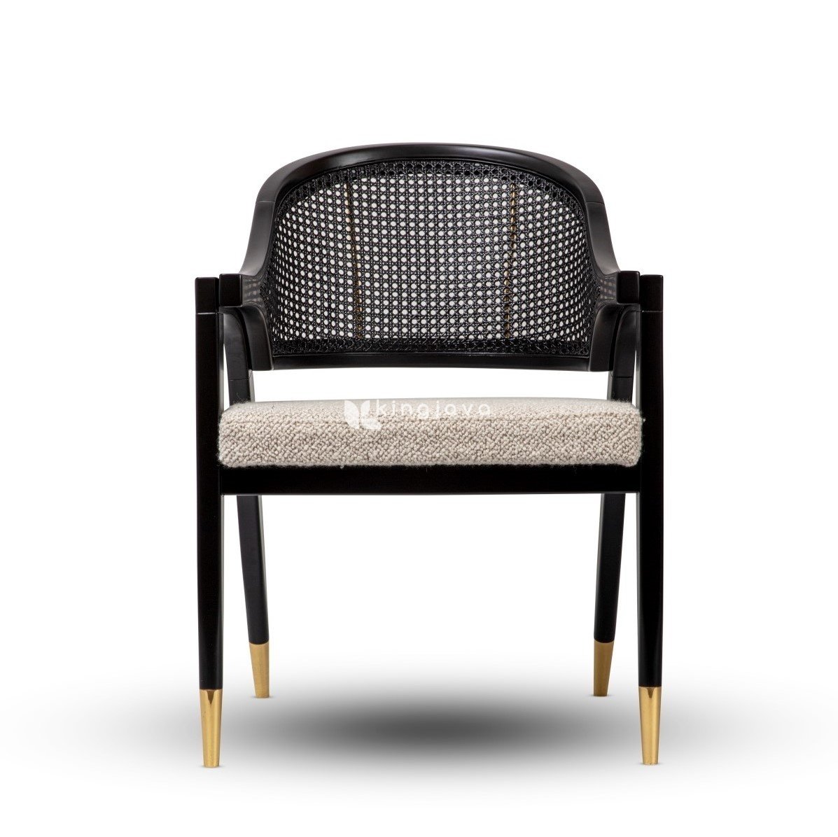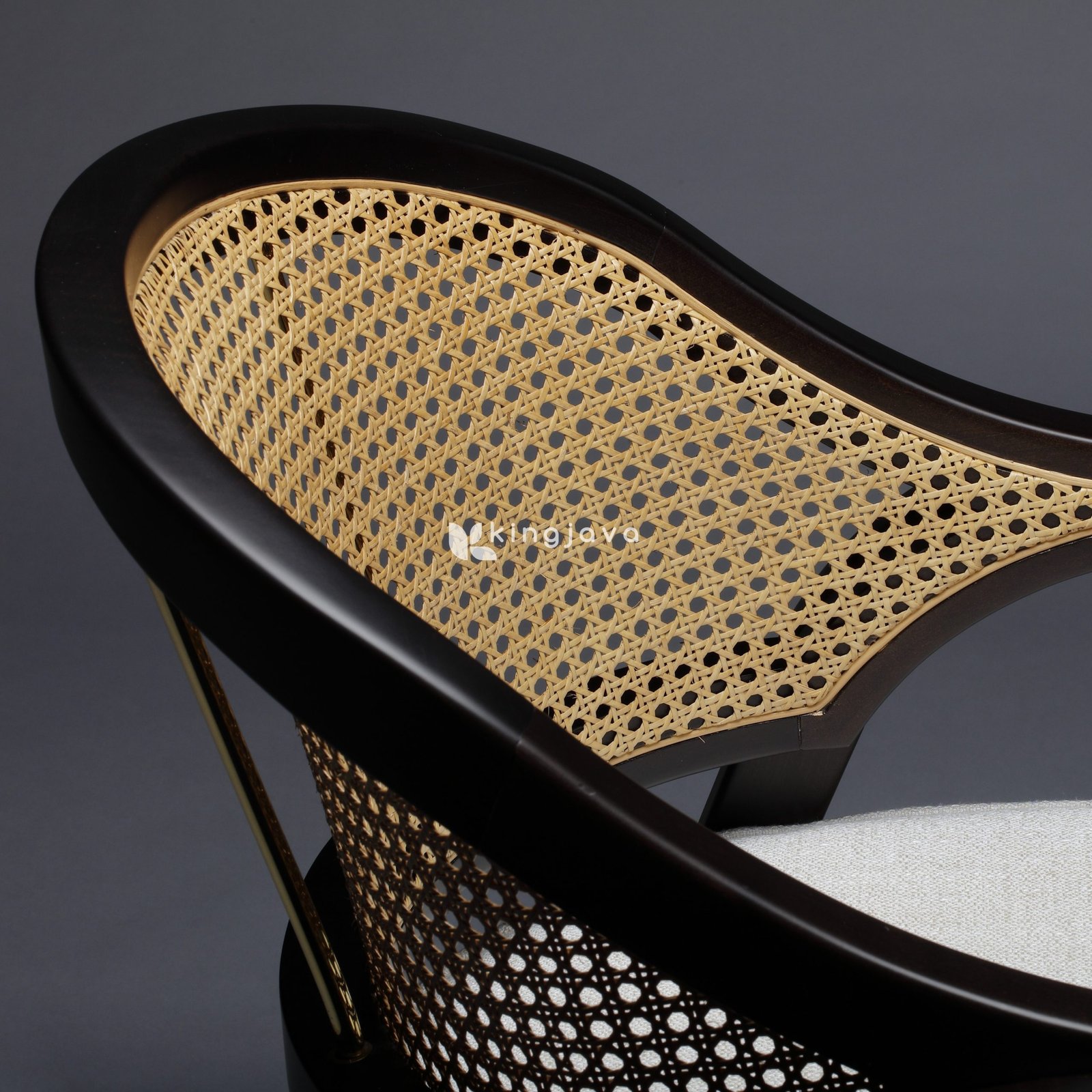 Sandaran kursi menampilkan anyaman rotan berkualitas tinggi dengan pola geometris yang menarik. Detail ini tidak hanya menambah estetika visual tetapi juga memberikan sirkulasi udara yang baik, menjaga Anda tetap nyaman saat duduk dalam waktu lama. Dudukan kursi dilapisi dengan kain 100% polyester berwarna krem yang lembut dan tahan lama. Kain ini memberikan kenyamanan ekstra dan mudah dibersihkan.