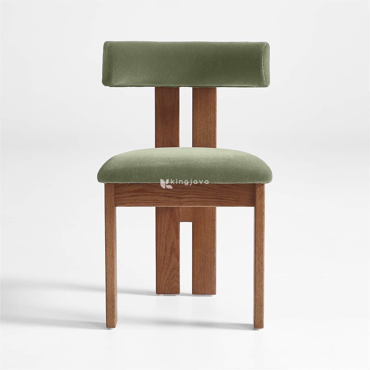 Desainnya yang ramping dan bersih menampilkan kaki-kaki tebal yang menopang struktur dengan stabil. Bagian sandaran punggung memiliki desain unik dengan dua balok kayu vertikal yang kokoh, dihubungkan oleh balok horizontal, menciptakan siluet yang menarik dan modern. Sandaran dan dudukan kursi dilapisi dengan kain bludru berkualitas tinggi berwarna hijau sage yang lembut dan mewah, memberikan sentuhan visual yang menenangkan dan tekstur yang menyenangkan saat disentuh. Bantalan yang empuk pada dudukan dan sandaran rendahnya dirancang untuk memberikan kenyamanan optimal, menjadikannya pilihan ideal untuk sesi makan yang panjang atau percakapan santai.