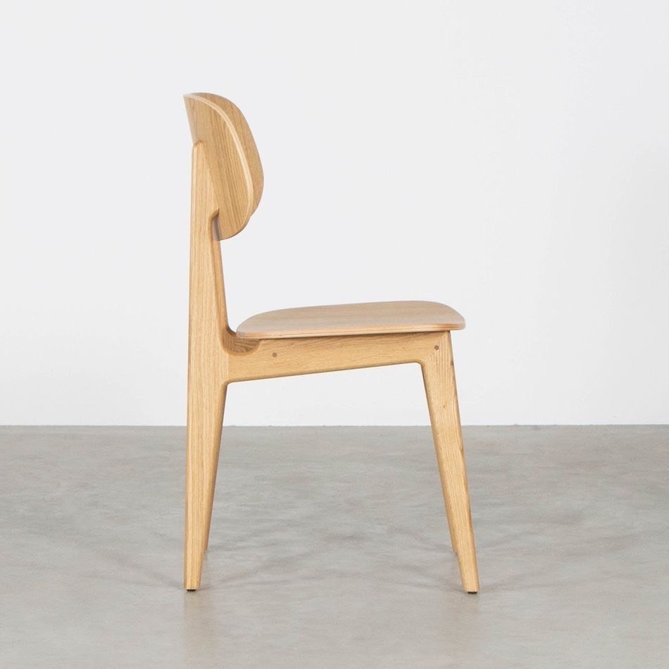 Material utama kursi ini adalah kayu solid dengan serat alami yang indah. Finishing semi-glossy natural menonjolkan kehangatan dan tekstur kayu, memberikan kesan alami dan mewah. Warna kayu yang cerah memberikan kesan ceria dan menyegarkan pada ruangan. Detail konstruksi yang kokoh menjamin durabilitas dan stabilitas kursi ini.