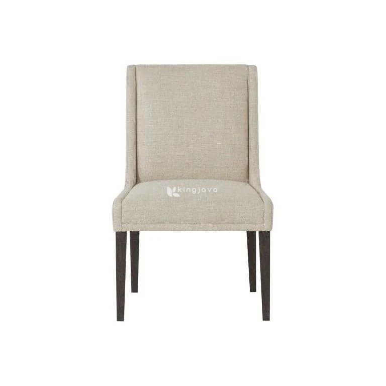 Konstruksi Kursi Makan Phi mengandalkan rangka kayu solid yang tersembunyi dengan cermat di bawah lapisan busa kepadatan tinggi dan kain pelapis, menjamin kekuatan dan durabilitas jangka panjang. Kaki-kaki kursi yang ramping dan meruncing, terbuat dari kayu solid dengan finishing satin berwarna coklat gelap, memberikan kontras yang elegan serta stabilitas yang tak tergoyahkan. Sudut kemiringan kaki belakang yang strategis menambah keseimbangan dan sentuhan desain yang dinamis. Dari berbagai sudut pandang, terlihat jelas bahwa jahitan pada pelapis dikerjakan dengan sangat rapi dan presisi, membentuk garis-garis tegas yang memperkuat bentuk keseluruhan kursi. Proporsinya yang seimbang, dengan sandaran punggung yang cukup tinggi, menawarkan dukungan ergonomis yang sangat baik, memastikan kenyamanan maksimal selama santap malam yang panjang atau pertemuan sosial. Kursi Phi adalah investasi dalam gaya dan kenyamanan, dirancang untuk menjadi pusat perhatian yang fungsional di rumah atau bisnis Anda.