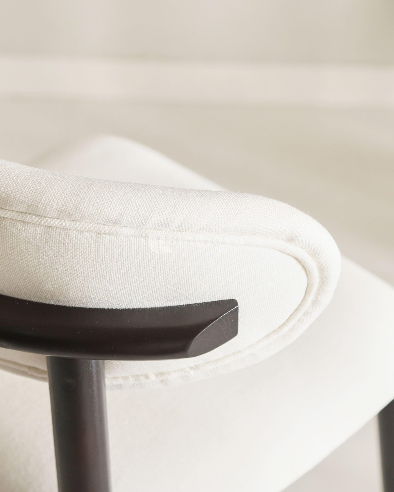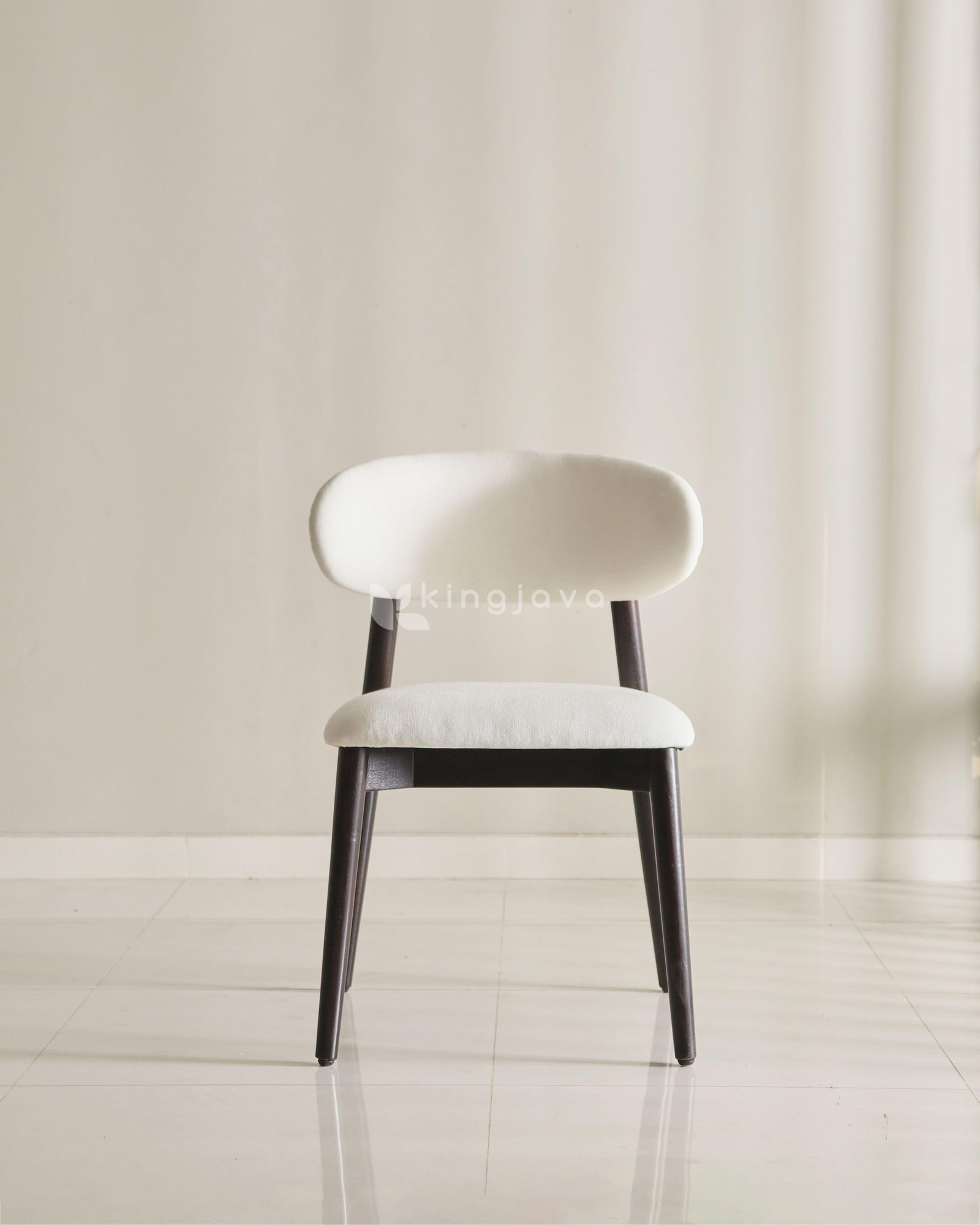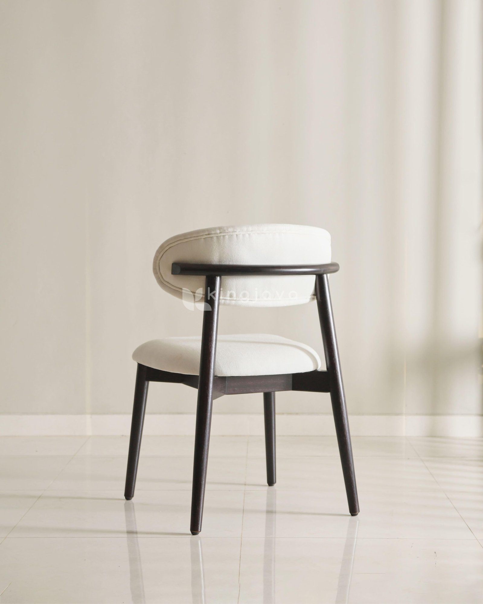 Kursi ini dirancang dengan mengutamakan ergonomi. Sandaran punggung yang melengkung memberikan pelukan sempurna pada tubuh, memastikan Anda tetap nyaman meski duduk dalam waktu lama. Penggunaan material kain (upholstery) berkualitas tinggi pada dudukan memberikan sentuhan lembut sekaligus tampilan yang bersih dan mewah.