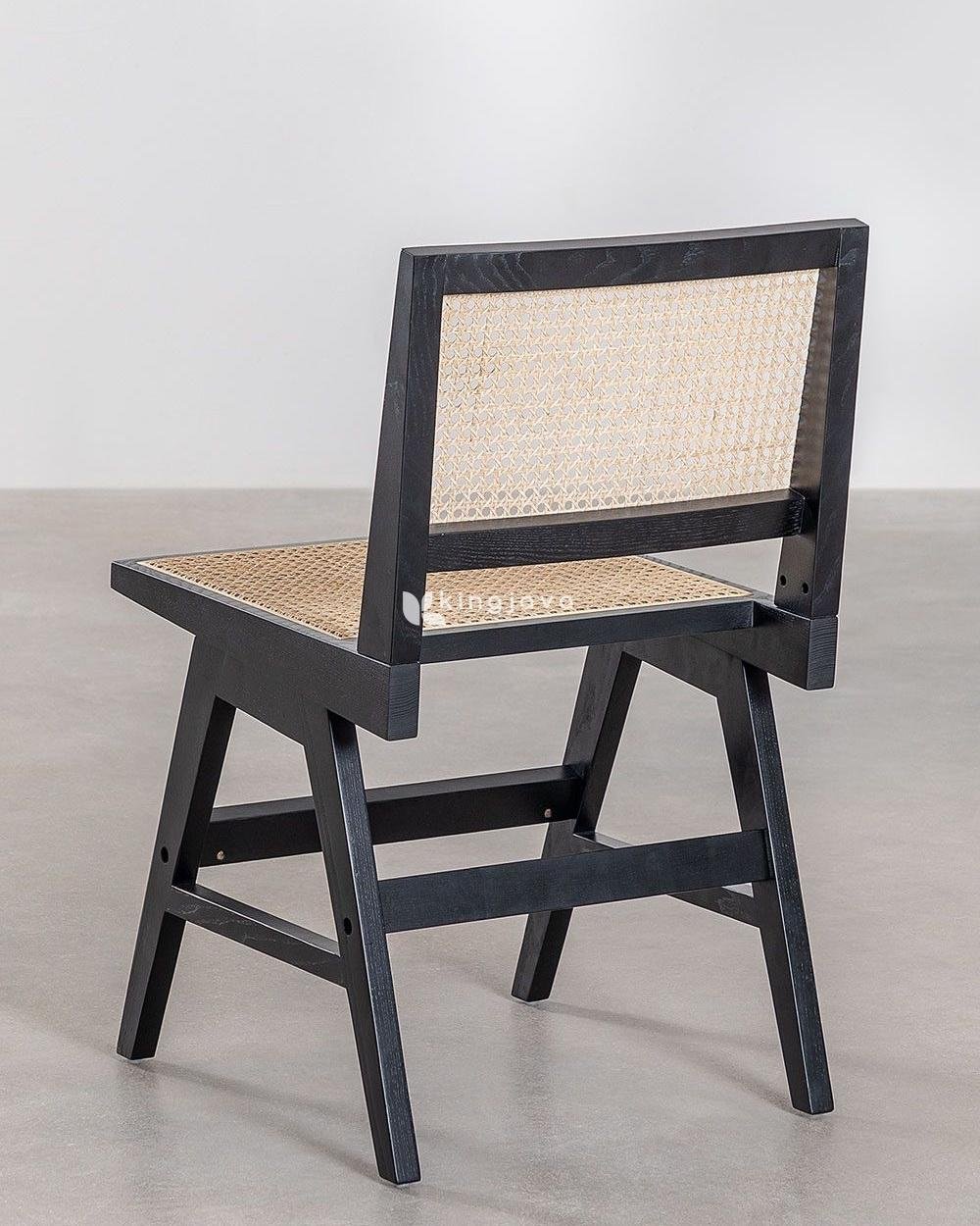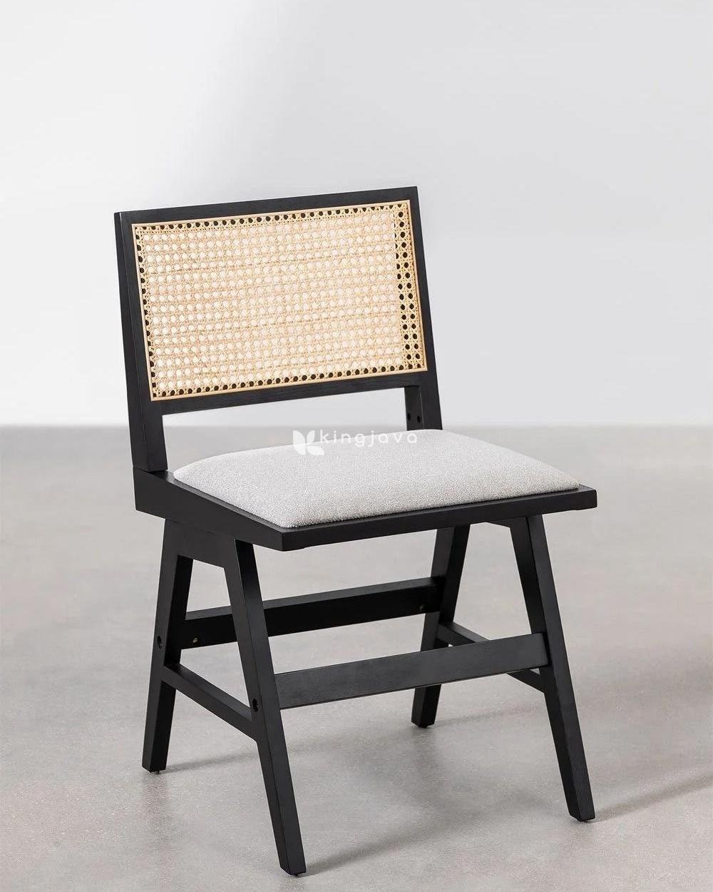 Rangka kursi terbuat dari kayu solid yang kuat dan tahan lama. Kayu ini difinishing dengan warna hitam pekat yang memberikan kesan mewah dan modern. Finishing yang digunakan tampak halus dan merata, menonjolkan tekstur alami kayu. Bagian sandaran kursi diisi dengan anyaman rotan alami yang memberikan sentuhan tradisional dan sirkulasi udara yang baik, sehingga nyaman digunakan dalam waktu lama. Warna rotan yang cerah kontras dengan warna hitam rangka, menciptakan tampilan visual yang menarik.