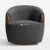 Material kain berwarna abu-abu gelap membungkus seluruh bagian kursi, memberikan tekstur yang lembut dan nyaman saat bersentuhan dengan kulit. Kain ini tampak tahan lama dan memberikan kesan mewah pada kursi. Aksen kayu solid pada lengan kursi memiliki bentuk melengkung ergonomis, memberikan pegangan yang nyaman dan menambah nilai estetika. Alas putar dari kayu dengan finishing natural memberikan fleksibilitas gerakan 360 derajat, memungkinkan Anda untuk dengan mudah berinteraksi dengan lingkungan sekitar.