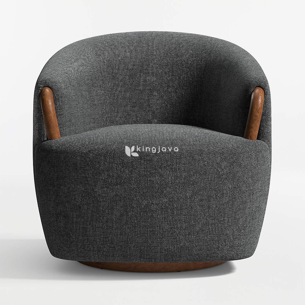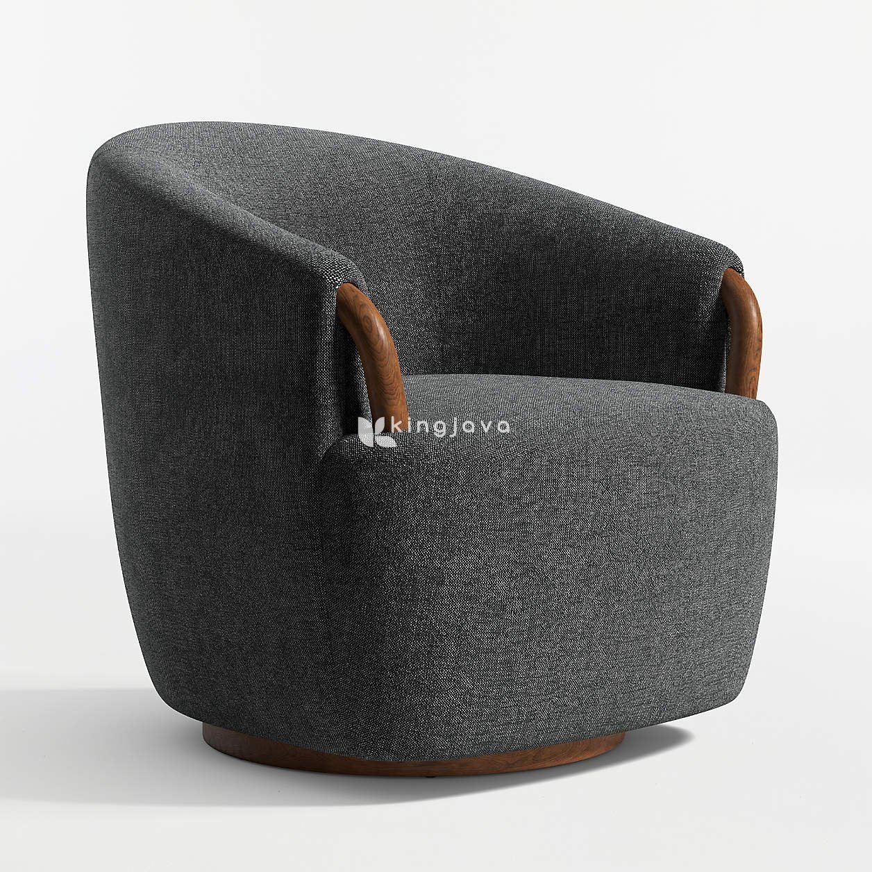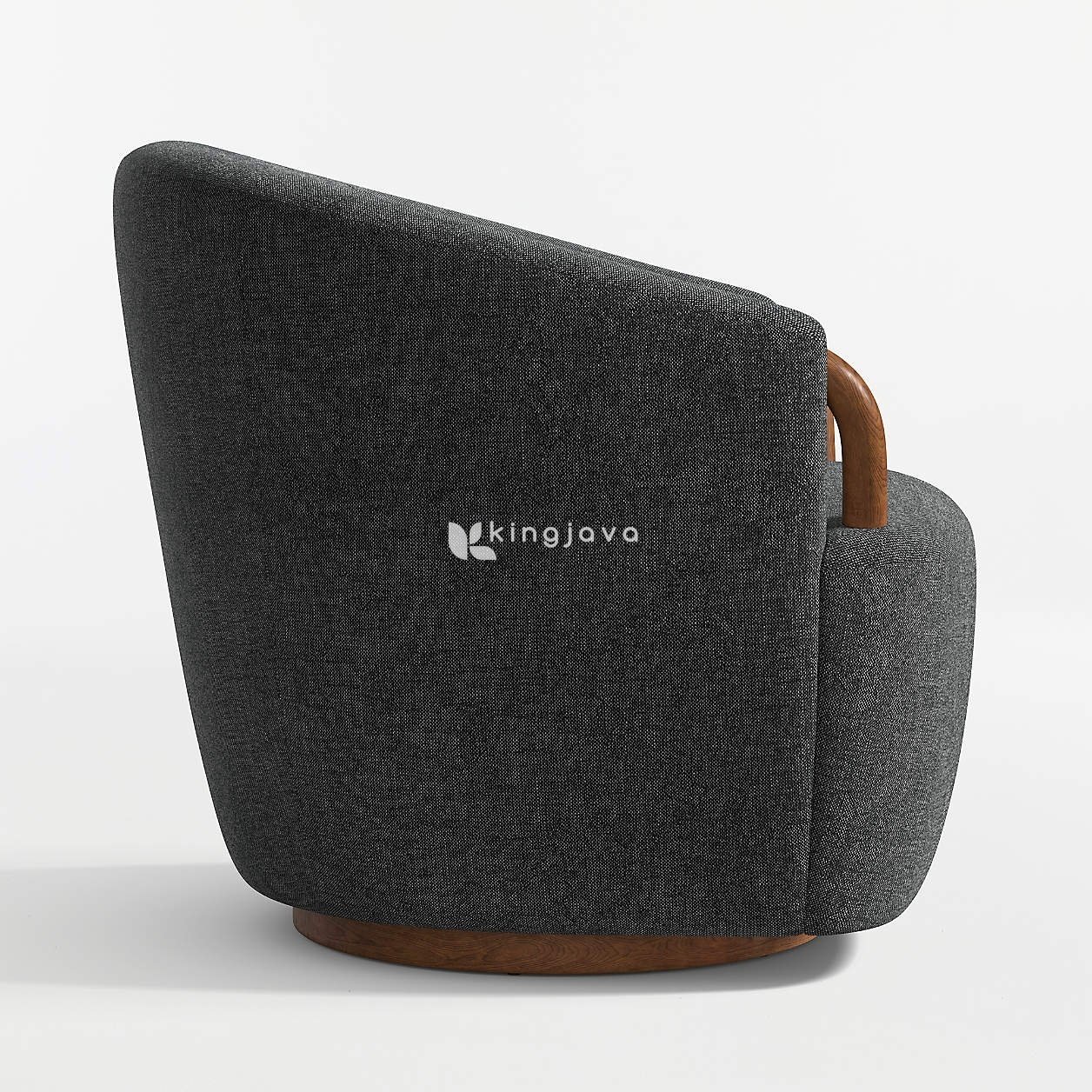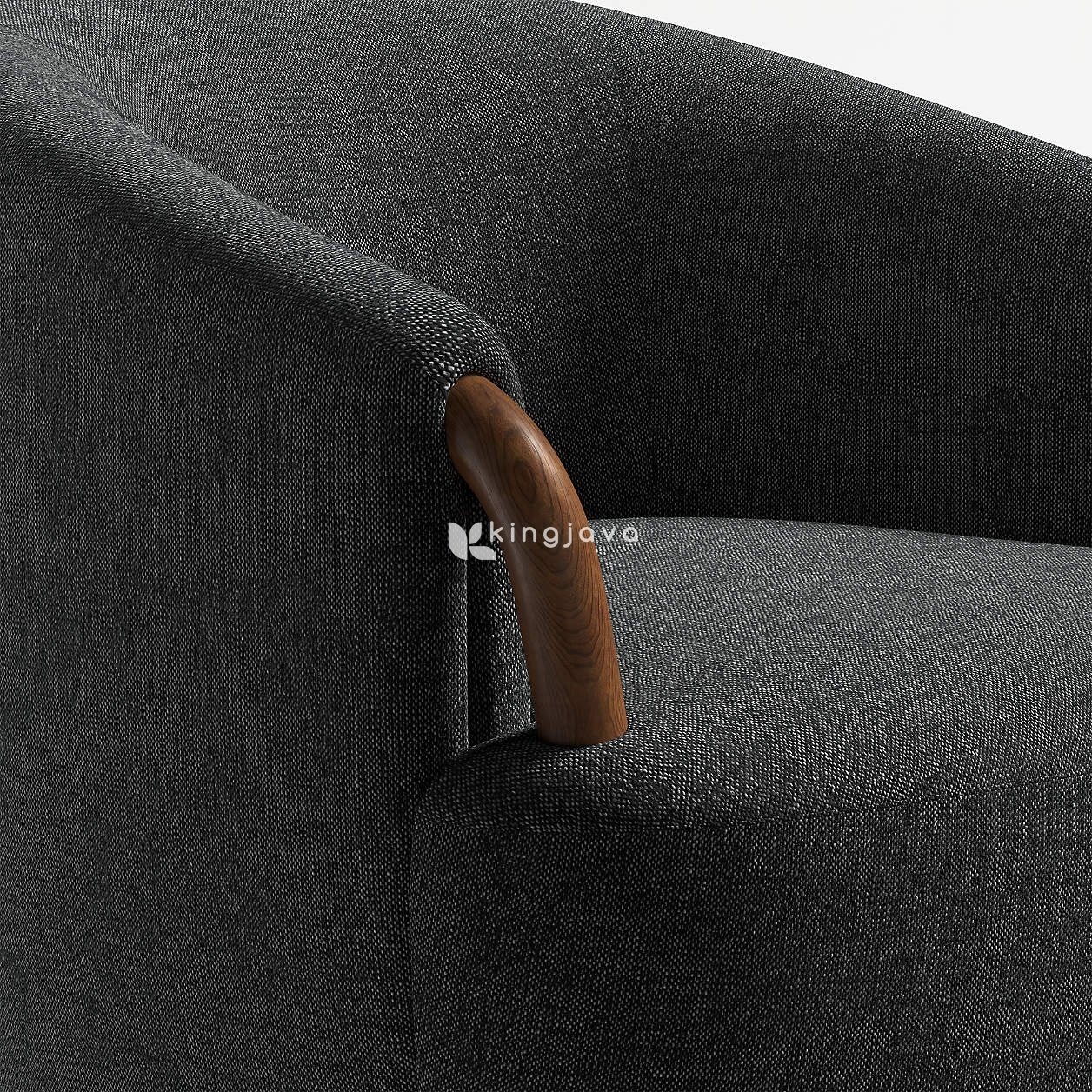 Material kain berwarna abu-abu gelap membungkus seluruh bagian kursi, memberikan tekstur yang lembut dan nyaman saat bersentuhan dengan kulit. Kain ini tampak tahan lama dan memberikan kesan mewah pada kursi. Aksen kayu solid pada lengan kursi memiliki bentuk melengkung ergonomis, memberikan pegangan yang nyaman dan menambah nilai estetika. Alas putar dari kayu dengan finishing natural memberikan fleksibilitas gerakan 360 derajat, memungkinkan Anda untuk dengan mudah berinteraksi dengan lingkungan sekitar.