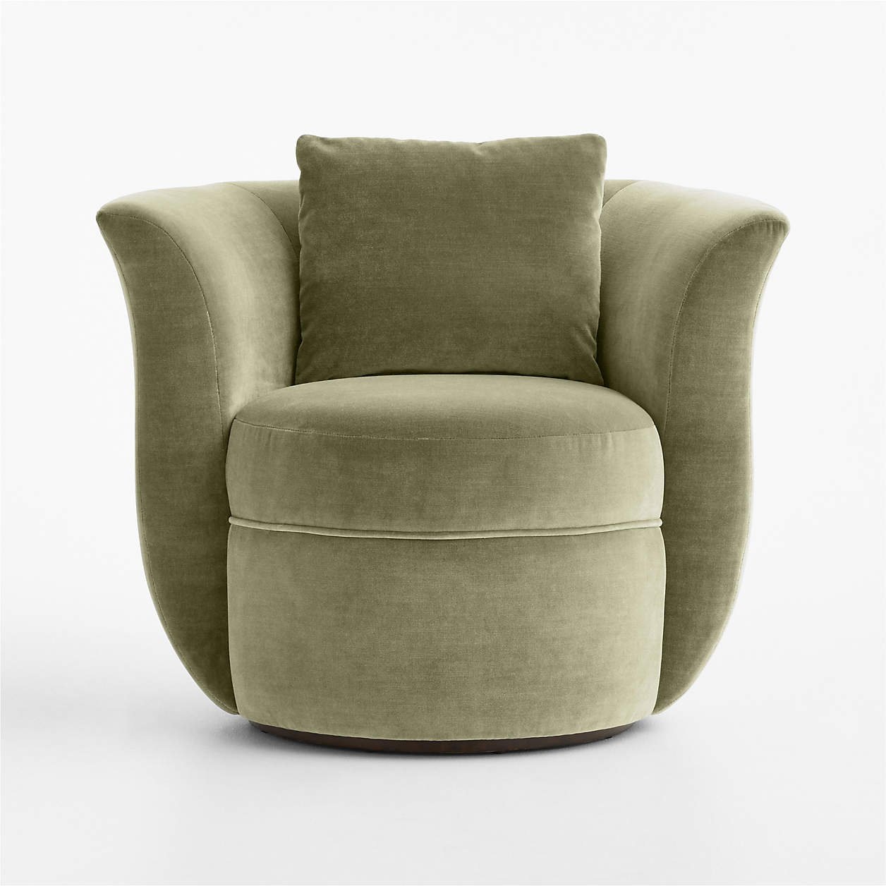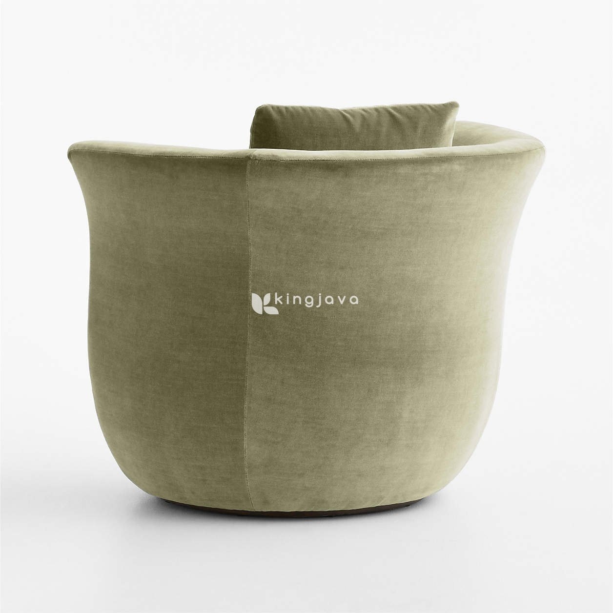 Material velvet memberikan sentuhan lembut dan mewah, serta menambah kedalaman pada warna hijau olive yang kalem. Bagian dasar kursi terbuat dari kayu dengan finishing dark brown yang memberikan kontras yang indah dan menyeimbangkan keseluruhan desain. Bentuknya yang bulat dan kemampuan untuk berputar 360 derajat, menjadikan kursi ini ideal untuk bersantai, membaca buku, atau sekadar menikmati waktu istirahat.