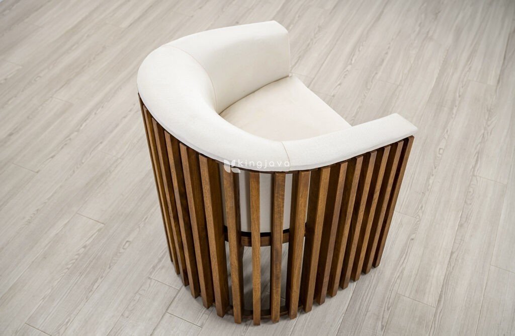 Bagian dudukan dan sandaran kursi dibalut dengan kain fabric lembut berwarna krem atau off-white yang mewah, memberikan kontras yang harmonis dengan bingkai kayu. Bantalan yang tebal dan empuk didesain ergonomis, mengikuti lekuk tubuh untuk memastikan kenyamanan maksimal saat bersantai. Sandaran tangan yang terintegrasi dengan bantalan melengkung menambah kesan mewah dan kenyamanan ekstra. Dari sudut pandang atas, terlihat jelas lekukan lembut sandaran yang menyatu dengan lengan, menciptakan siluet yang mengundang. Detail sambungan pada bingkai kayu menunjukkan keahlian pengerjaan yang tinggi, dengan setiap komponen terpasang erat dan mulus, tanpa celah yang terlihat. Proporsi kursi ini dirancang agar terlihat ringkas namun tetap memberikan ruang duduk yang lapang dan nyaman, cocok untuk berbagai ukuran ruangan. Kombinasi warna natural dan krem yang timeless menjadikan kursi Makoto mudah dipadukan dengan berbagai tema interior, dari minimalis hingga kontemporer.