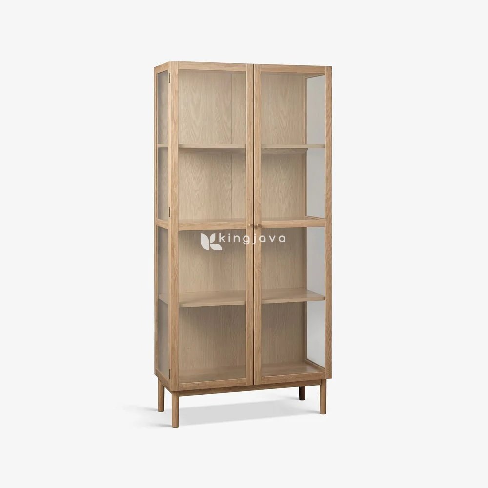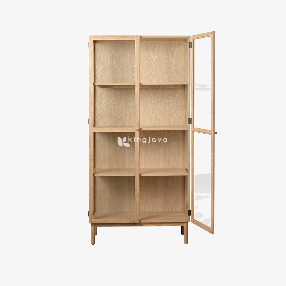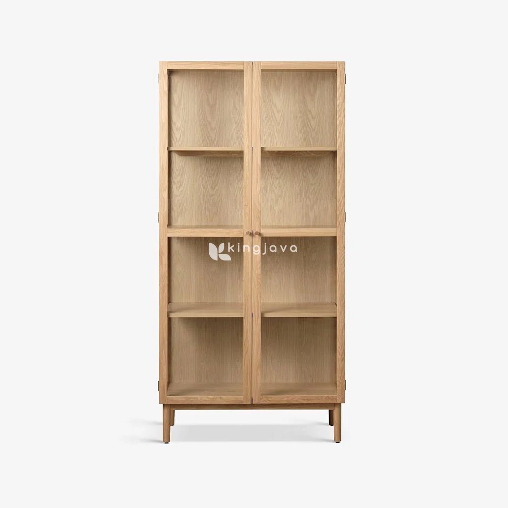 Material utama lemari ini adalah kayu oak solid dengan finishing semi-glossy natural yang menonjolkan serat kayu yang indah. Pintu kaca bening memungkinkan pandangan yang jelas ke dalam lemari, sementara rak-rak kayu oak yang kokoh menyediakan ruang penyimpanan yang luas. Detail konstruksi yang halus terlihat pada sambungan kayu yang presisi dan rangka yang kuat. Bagian kaki lemari didesain tinggi untuk memberikan kesan ringan dan memudahkan pembersihan.