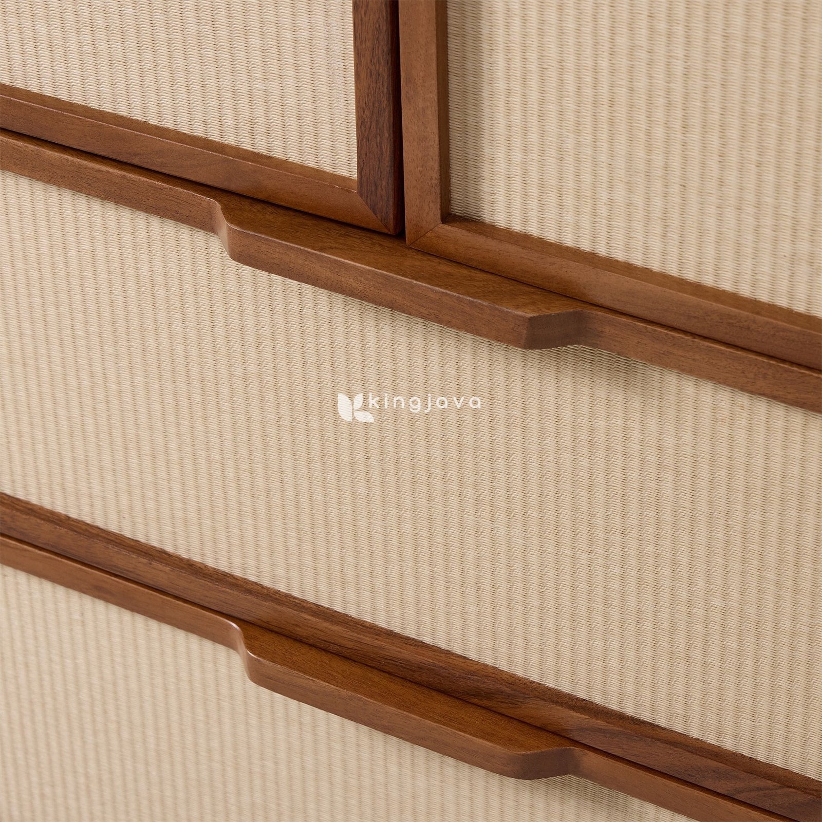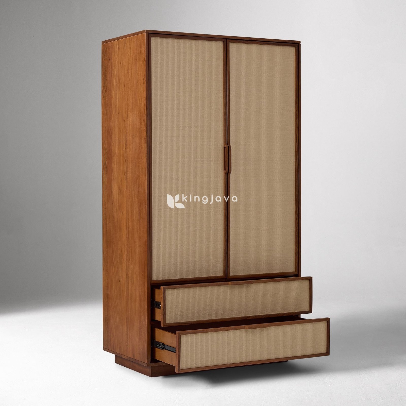 Bagian pintu lemari dilapisi dengan anyaman rotan berwarna krem yang memberikan tekstur unik dan tampilan yang segar. Dua pintu utama membuka ruang penyimpanan luas dengan gantungan baju, ideal untuk menyimpan pakaian panjang dan gaun. Di bagian bawah terdapat dua laci dengan bagian depan berlapis rotan senada, memberikan ruang tambahan untuk menyimpan pakaian lipat, aksesori, atau barang-barang pribadi lainnya. Tarikan laci terbuat dari kayu jati yang serasi dengan rangka, menciptakan tampilan yang harmonis.