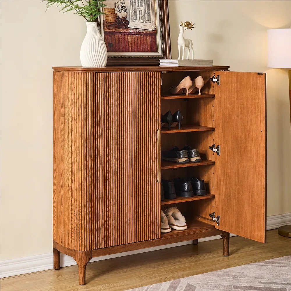 - Material Utama: Kayu solid dengan panel pintu bertekstur reeded/fluted. Rak internal dari kayu yang serasi. Pegangan logam berwarna kuningan brushed.