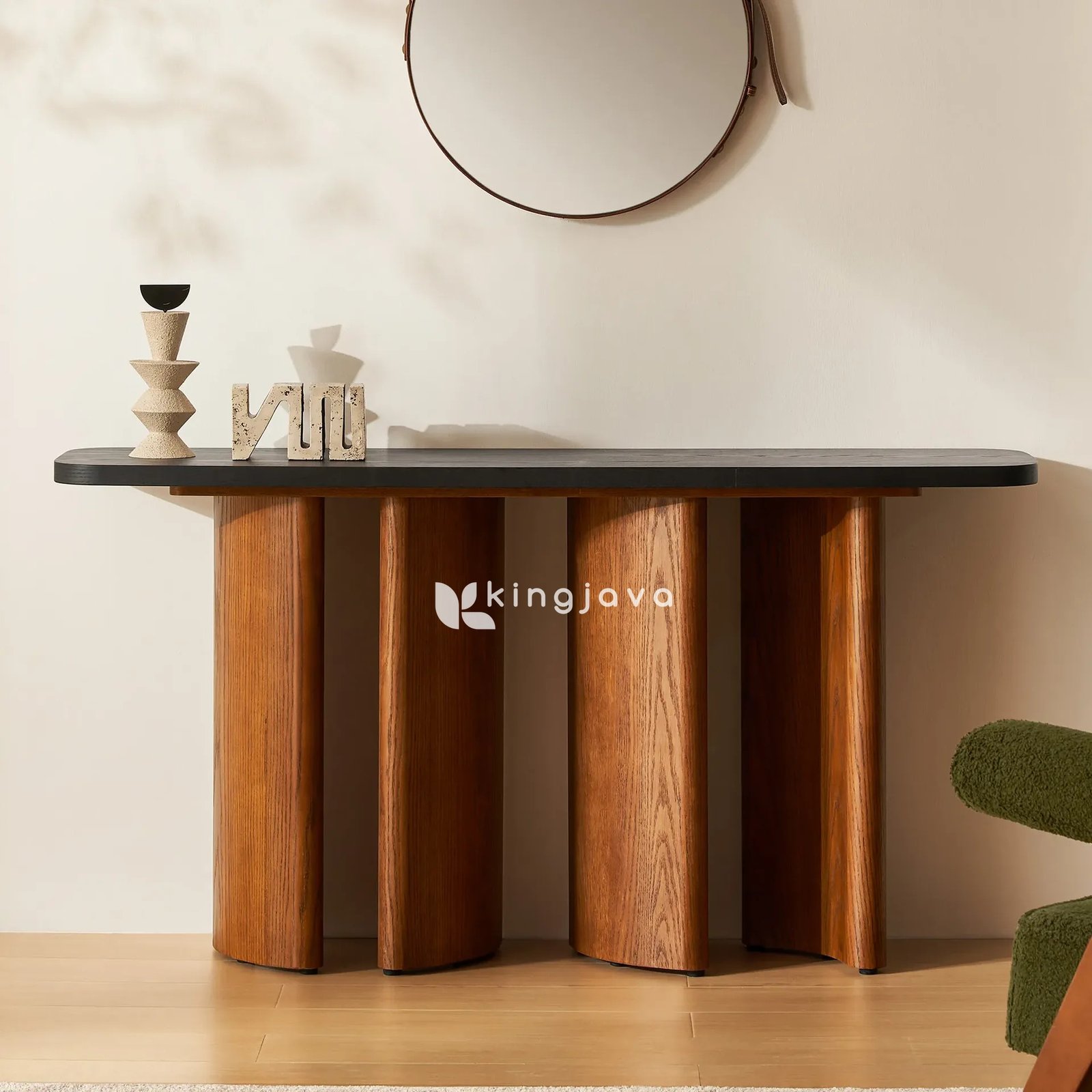Meja Konsol Kayu Jati Solid Modern Minimalis – Kaira adalah pilihan tepat bagi Anda yang mencari sentuhan elegan dan fungsional untuk hunian modern. Meja konsol ini tampil dengan desain minimalis yang menawan, menampilkan permukaan meja berwarna hitam solid yang kontras dengan kaki-kaki kayu jati berbentuk silinder. Selain itu, tekstur kayu jati yang alami memberikan kehangatan dan karakter pada ruangan. Dengan demikian, meja konsol ini akan menjadi focal point yang menarik perhatian di ruang tamu, lorong, atau kamar tidur Anda.