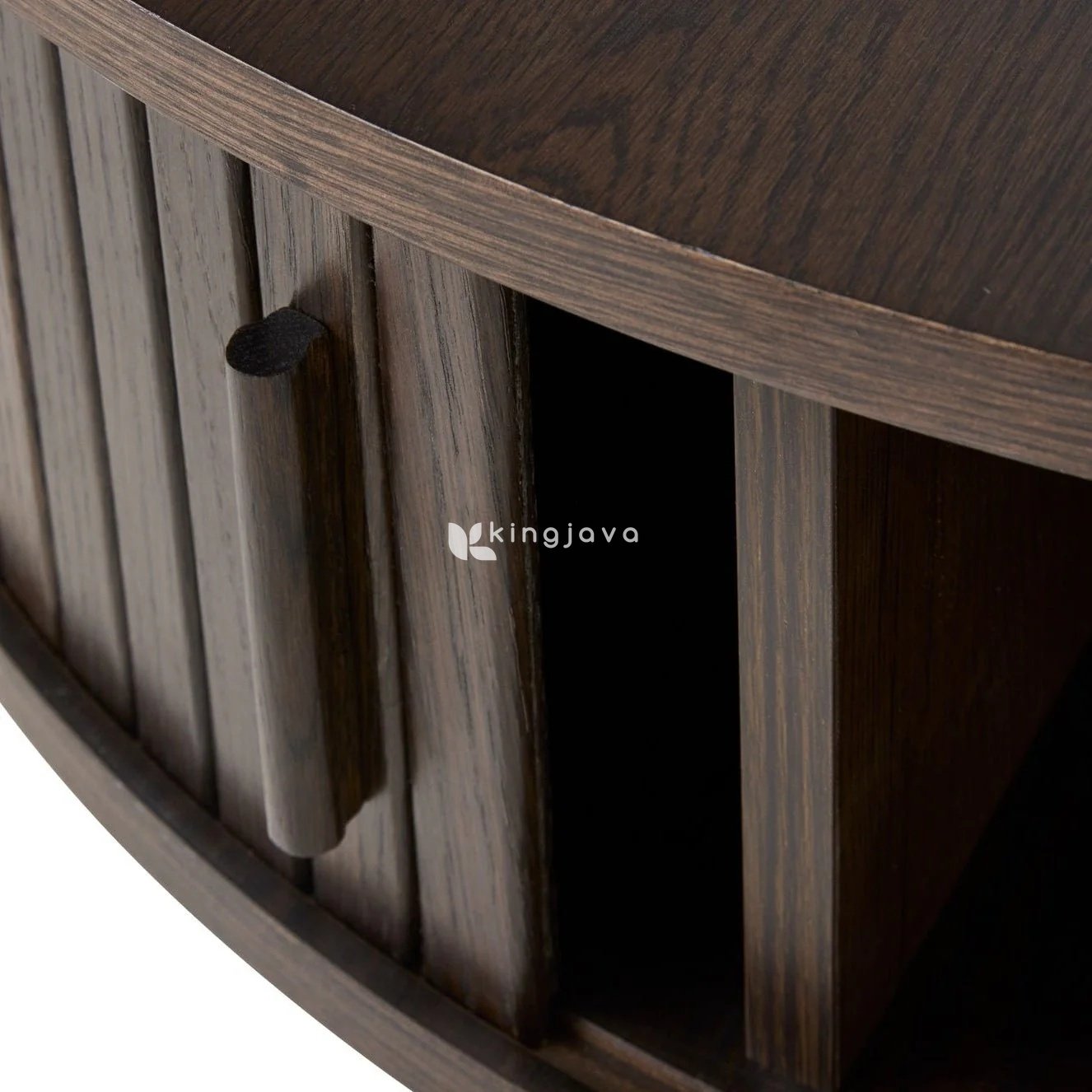 - Nama Produk: Meja Kopi Bundar Kayu Solid Modern dengan Pintu Geser – Luminara