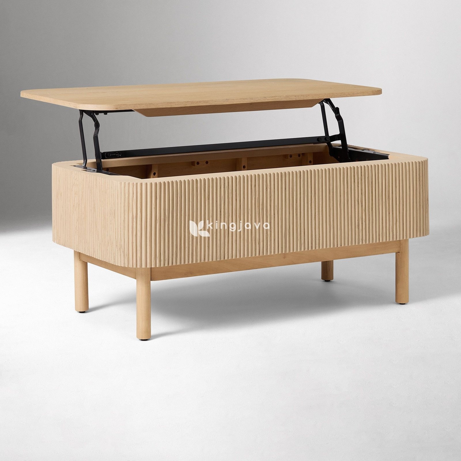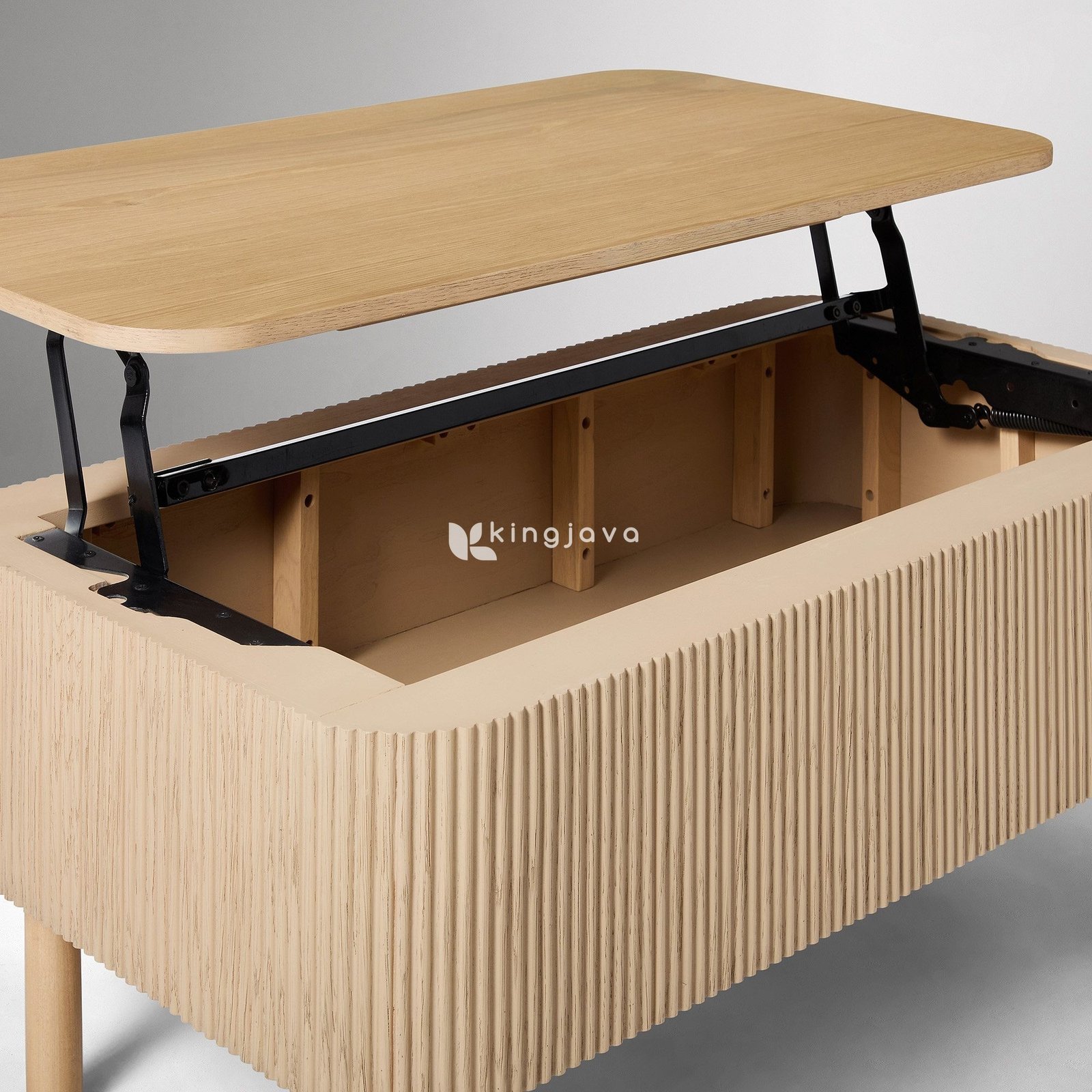 Bagian permukaan meja memiliki sudut membulat yang halus, memberikan kesan lembut dan aman, cocok untuk rumah dengan anak-anak. Fitur unggulan dari meja kopi Akira adalah mekanisme lift-top yang inovatif. Dengan sistem engsel hidrolik logam berwarna hitam yang kokoh, permukaan meja dapat diangkat dengan mudah ke ketinggian yang lebih optimal, mengubah fungsi meja kopi menjadi meja kerja sementara atau meja makan ringan yang nyaman dari sofa Anda. Saat permukaan meja terangkat, terungkaplah ruang penyimpanan tersembunyi yang luas di dalamnya. Kompartemen ini dirancang untuk menyimpan berbagai benda seperti remote TV, majalah, laptop, atau barang-barang kecil lainnya agar tetap rapi dan terorganisir, menjaga tampilan ruang tamu Anda tetap bersih dan bebas dari kekacauan.