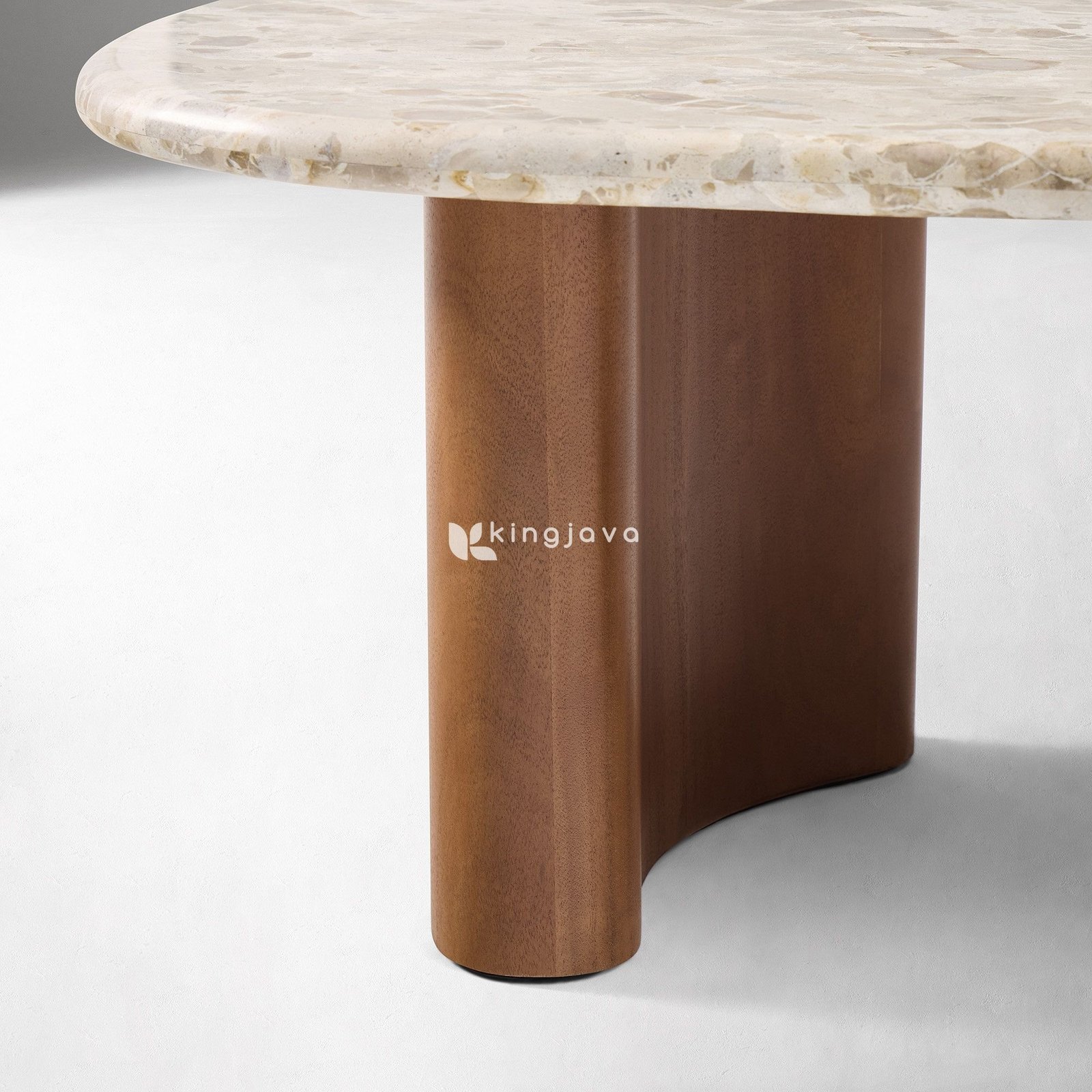 Kaki meja Kaito dirancang dengan bentuk silinder terpotong yang kokoh, terbuat dari kayu solid berkualitas tinggi seperti jati atau mahoni. Warna coklat hangat pada kaki kayu ini menciptakan kontras yang indah dengan permukaan batu yang lebih terang, menambah kedalaman visual pada desainnya. Finishing satin natural pada kayu menonjolkan serat kayu vertikal yang halus dan memberikan rasa hangat alami. Bentuk kaki yang melengkung pada sisi luar dan datar pada sisi dalam tidak hanya menambah estetika modern organik, tetapi juga menjamin stabilitas dan durabilitas yang luar biasa. Sambungan antara permukaan meja batu dan kaki kayu dirancang secara presisi, menciptakan transisi yang mulus dan tampilan bersih tanpa sambungan yang terlihat. Dengan proporsi yang seimbang dan konstruksi yang solid, Meja Kopi Kaito adalah investasi jangka panjang untuk mempercantik interior Anda.