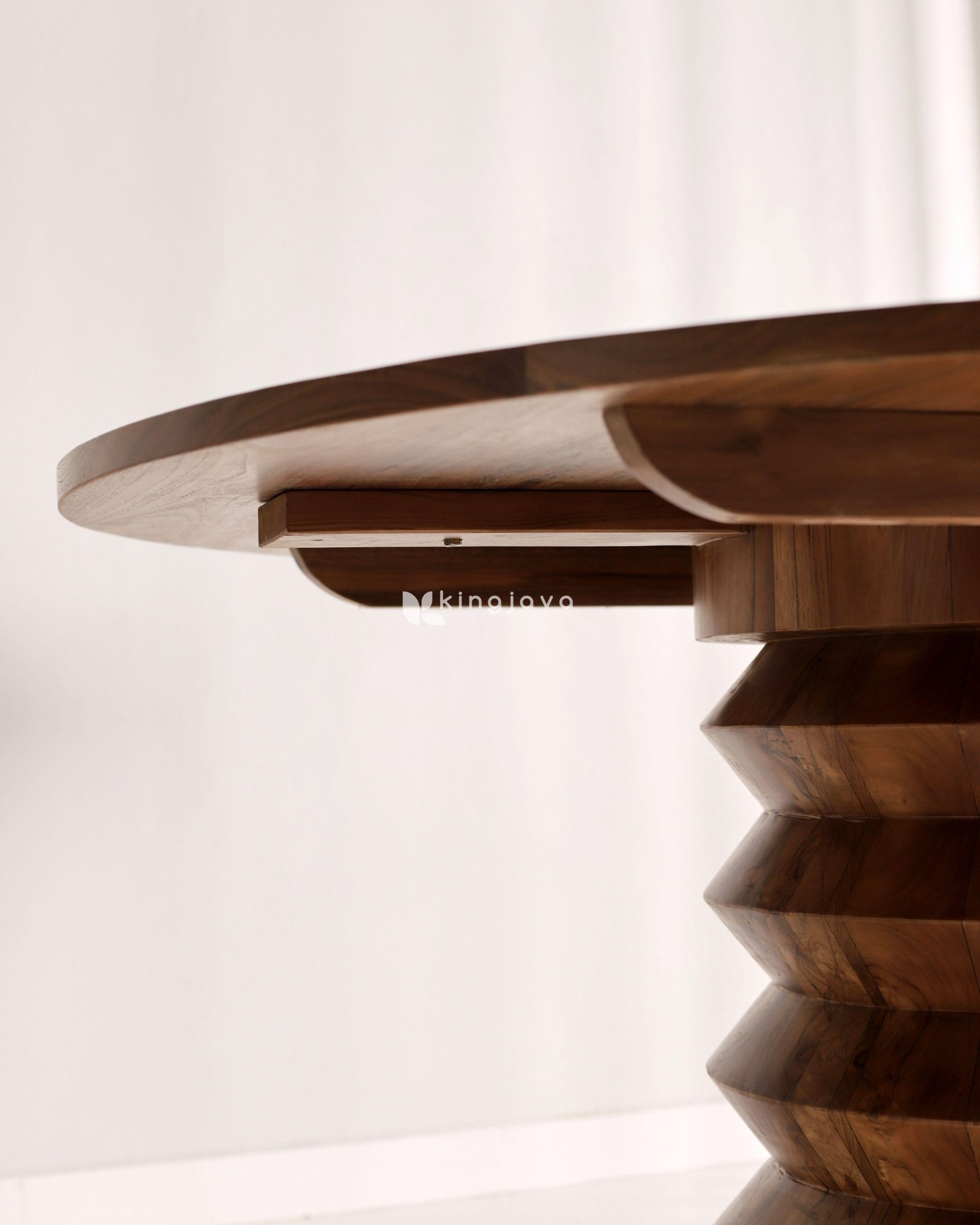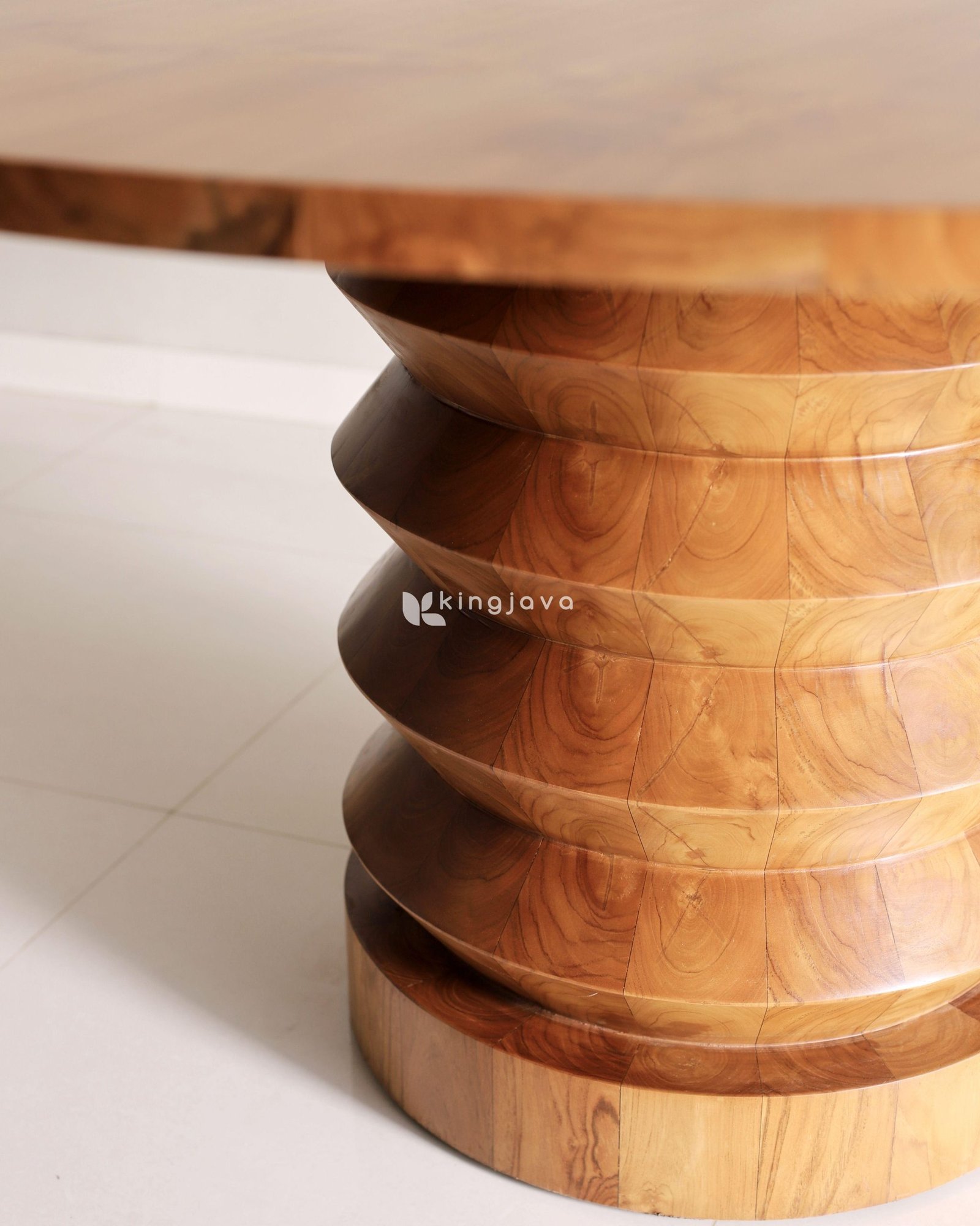 Dengan dimensi yang proporsional dan bentuk bulat yang lembut, meja ini dapat menjadi pusat perhatian di ruang makan atau ruang tamu. Material kayu jati yang digunakan tidak hanya memberikan kesan mewah namun juga menjamin ketahanan terhadap perubahan cuaca dan waktu. Finishing yang digunakan ramah lingkungan dan memberikan perlindungan ekstra pada permukaan kayu. Desain minimalisnya membuatnya mudah dipadukan dengan berbagai gaya dekorasi interior, mulai dari modern hingga klasik.