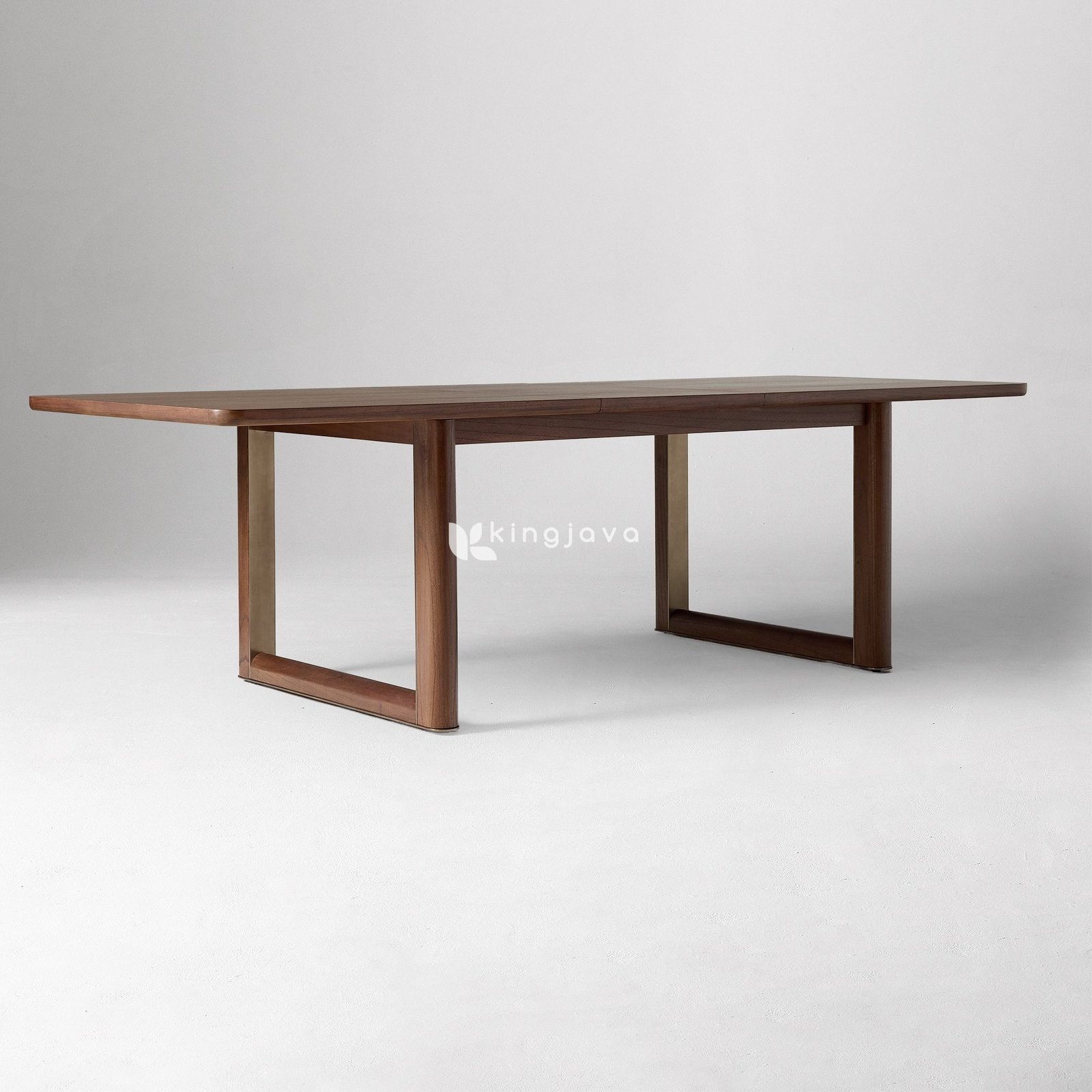 Desain rangka U yang unik memberikan kesan ringan namun tetap kokoh. Sambungan kayu yang presisi dan halus menunjukkan perhatian terhadap detail dalam setiap aspek konstruksi. Permukaan meja yang rata dan lebar sangat ideal untuk menampung berbagai hidangan dan perlengkapan makan, menjadikannya sempurna untuk acara makan keluarga atau jamuan makan bersama teman.