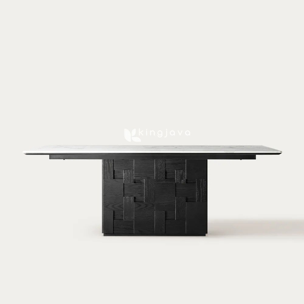 Meja Makan Kayu Solid Marmer Modern Kontemporer dengan Base Tekstur Geometris – Wezen hadir dengan desain yang memukau untuk memperkaya ruang makan Anda. Meja ini menampilkan top marmer putih yang elegan, kontras sempurna dengan base kayu solid berwarna hitam pekat. Bentuk persegi panjangnya menawarkan kesan minimalis namun tetap berkelas. Namun, detail tekstur geometris pada bagian base memberikan sentuhan artistik yang unik. Dengan demikian, ruangan pun terasa lebih mewah dan berkarakter.