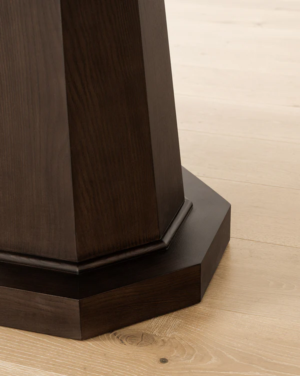 Material kayu solid premium menjadi fondasi kekuatan dan keindahan meja ini. Kekokohan kayu terasa dari sentuhan pertama, menjamin durabilitas jangka panjang. Finishing natural mempertegas serat kayu yang unik. Selain itu, detail konstruksi pedestal base yang kokoh memberikan stabilitas optimal.