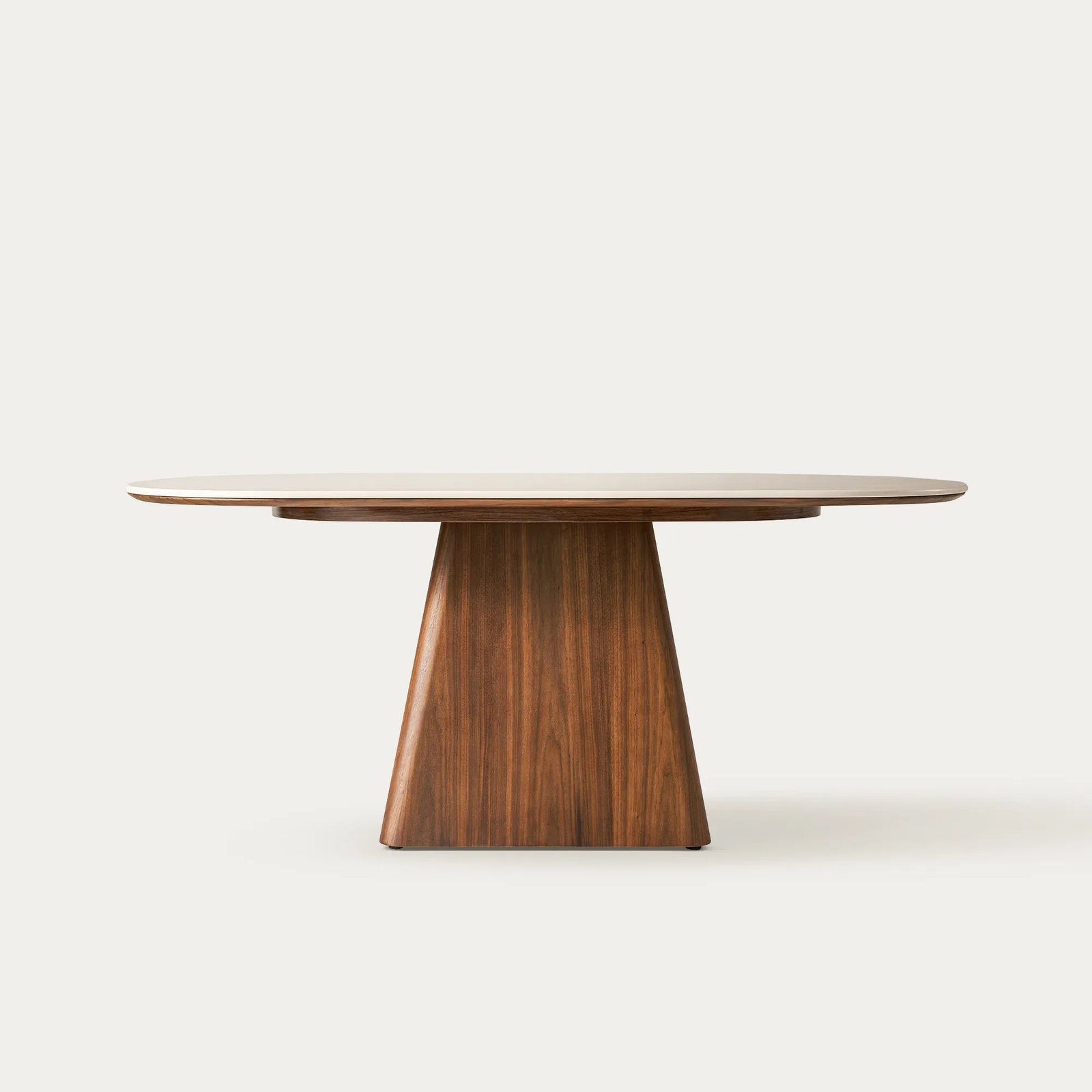 Penyangga utama meja ini adalah alas pedestal yang kokoh dan artistik, berbentuk trapesium yang melebar ke bawah untuk stabilitas optimal. Alas ini terbuat dari kayu jati solid, terkenal akan kekuatan dan durabilitasnya yang luar biasa, serta ketahanan terhadap perubahan cuaca dan hama. Kayu jati tersebut diperkaya dengan finishing warna walnut semi-glossy natural, yang menampilkan serat kayu alami yang indah dan kaya warna cokelat gelap yang hangat. Tekstur serat kayu jati terlihat jelas, memberikan karakter dan kedalaman visual pada desain keseluruhan. Perpaduan antara permukaan atas yang halus dan mengkilap dengan alas kayu jati yang bertekstur dan hangat menciptakan kontras yang menarik dan harmonis. Detail konstruksi sambungan antar bagian dirancang dengan sangat rapi dan presisi, memastikan kekuatan dan tampilan yang mulus tanpa celah yang terlihat. Meja Takahiro ini mampu menampung 6 kursi makan dengan nyaman, menjadikannya pilihan ideal untuk pertemuan keluarga atau acara makan malam dengan teman.