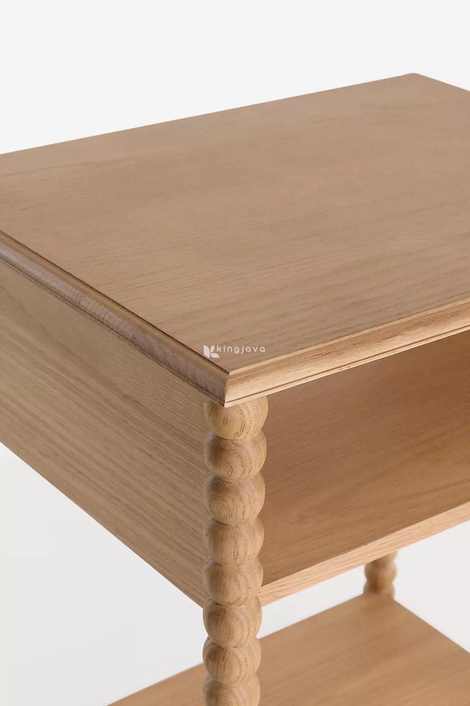 Meja Samping Kayu Solid Gaya Bobbin Tiga Tingkat – Liam adalah perwujudan sempurna dari desain fungsional yang berpadu dengan estetika klasik modern. Dibuat dengan cermat dari kayu solid berkualitas tinggi, meja samping ini menampilkan keindahan alami serat kayu yang terekspos dengan indah, memberikan sentuhan hangat dan autentik pada setiap ruang. Keunikan utama Liam terletak pada keempat kakinya yang dibubut dengan motif “bobbin” atau “spool” yang khas, menciptakan detail ornamen yang memukau dan memberikan karakter kuat yang membedakannya dari furniture lain.
