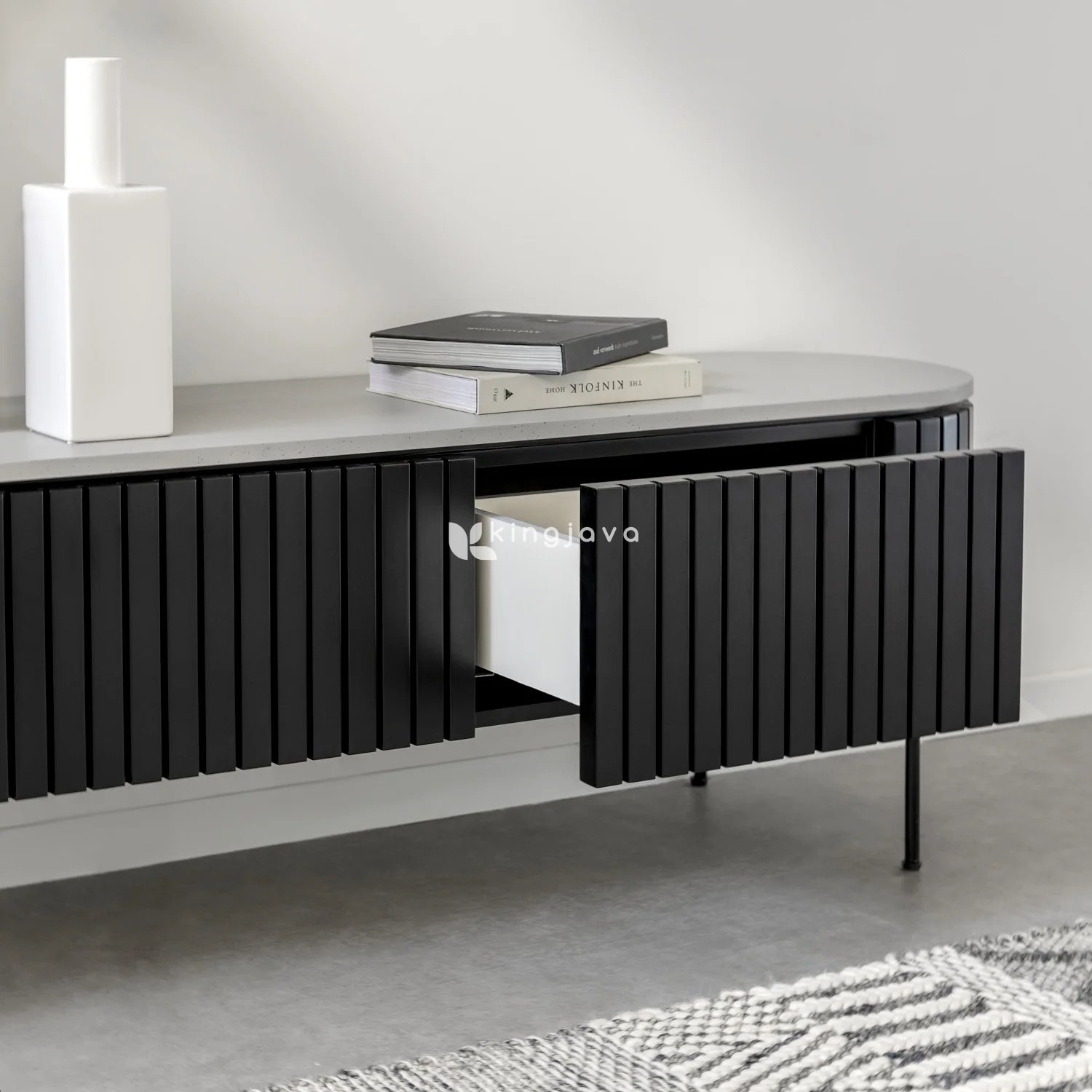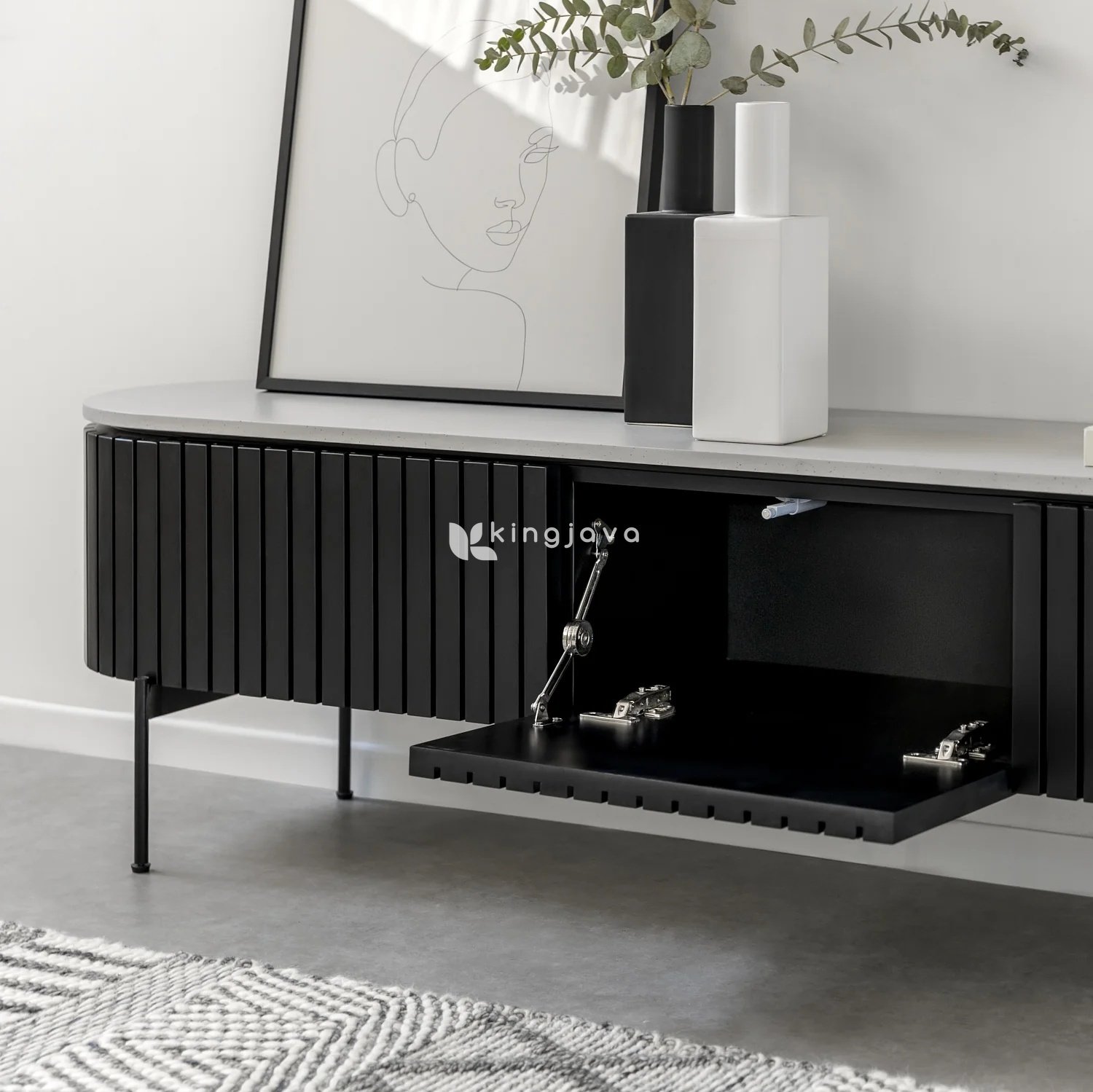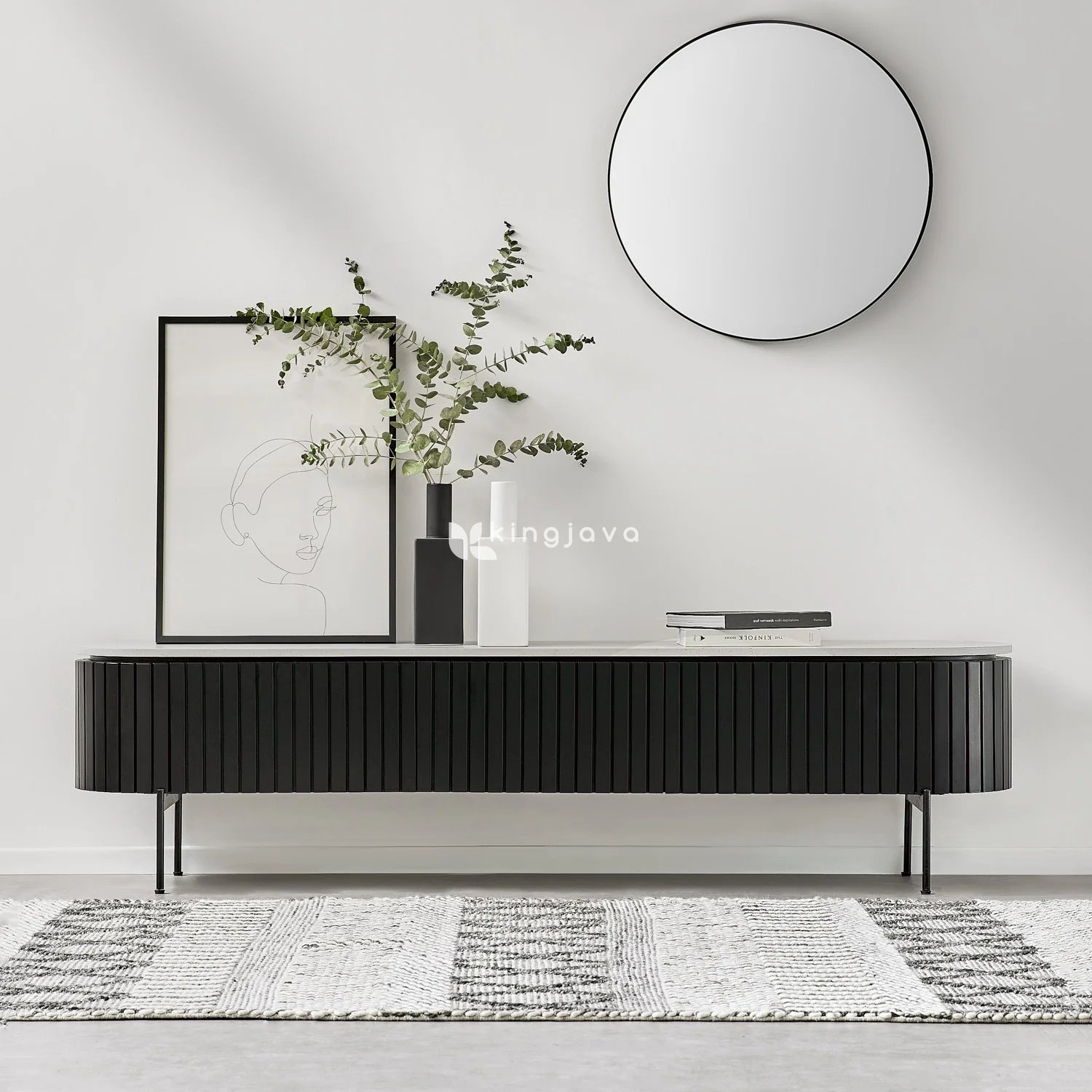 Meja TV Kayu Bergaris Hitam Minimalis Modern – Supreme adalah solusi penyimpanan yang elegan dan fungsional untuk ruang keluarga Anda. Meja TV ini memiliki desain minimalis modern dengan bentuk persegi panjang melengkung yang unik. Bagian depan meja dihiasi dengan garis-garis vertikal yang memberikan tekstur visual yang menarik dan menambah kesan kontemporer.